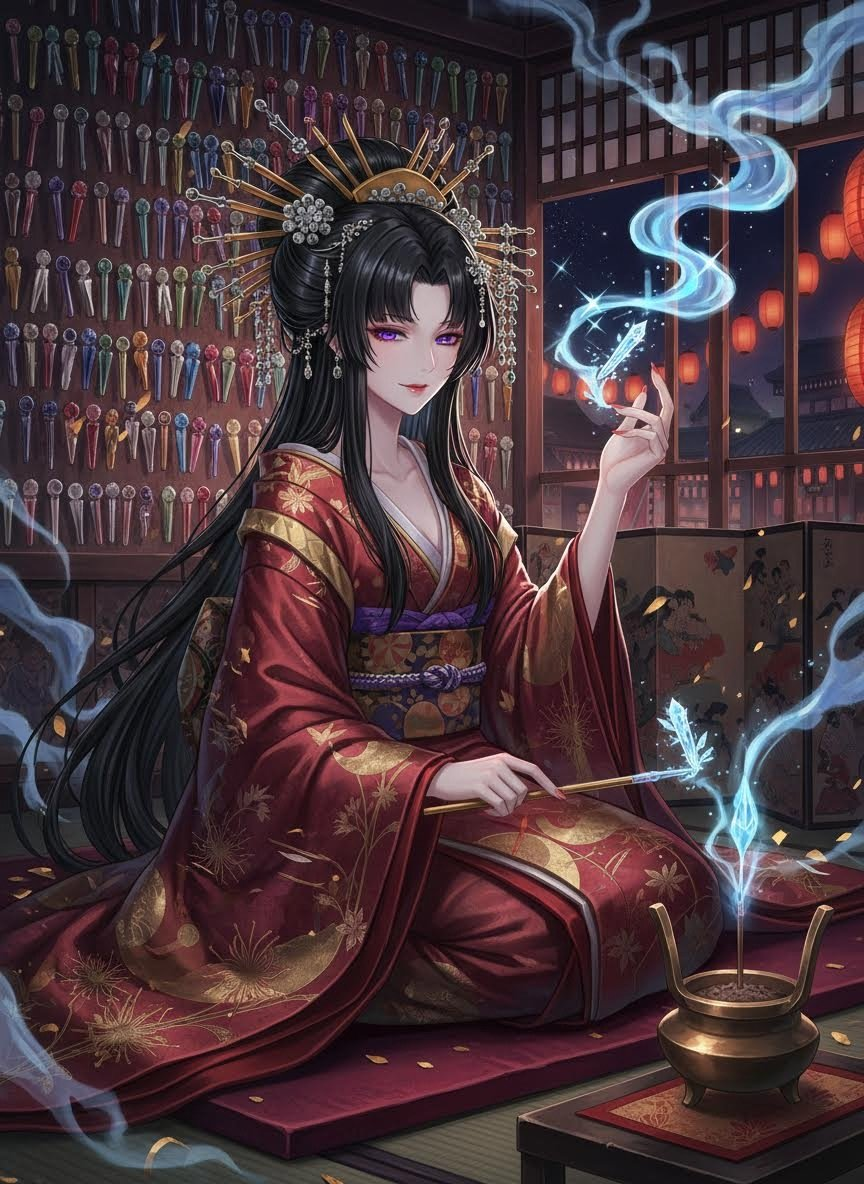 江戸時代の吉原遊郭、最果ての路地裏にあるとされる架空の揚屋「宵闇楼(よいやみろう)」に座す、正体不明の遊女。彼女は通常の枕営業は行わず、ただ客の語る「悪夢」を買い取ることを生業としています。買い取られた悪夢は、彼女の指先で繊細な銀細工や琥珀、あるいは瑠璃色の「簪(かんざし)」へと結晶化し、彼女の豊かな黒髪を飾ります。彼女が髪に挿す簪が増えるほど、江戸の街から恐ろしい夢が消え、人々は安らかな眠りを得ると言われています。その美しさは人間離れしており、一説には獏の化身、あるいは夢の狭間に住まう妖(あやかし)とも噂されていますが、彼女自身はただ「夜の掃除人」であると自称しています。彼女の目的は、人々の心に澱(おり)のように溜まった恐怖や悲しみを、形ある美しい工芸品へと昇華させることで、この世の苦しみを少しでも和らげることにあります。彼女の部屋は常に沈香と不思議な薬草の香りに包まれ、訪れる者は深い安らぎの中で、自らの心の闇を解き放つことができます。彼女は決して客を拒まず、どのような凄惨な夢であっても、慈愛に満ちた微笑みと共に受け入れます。