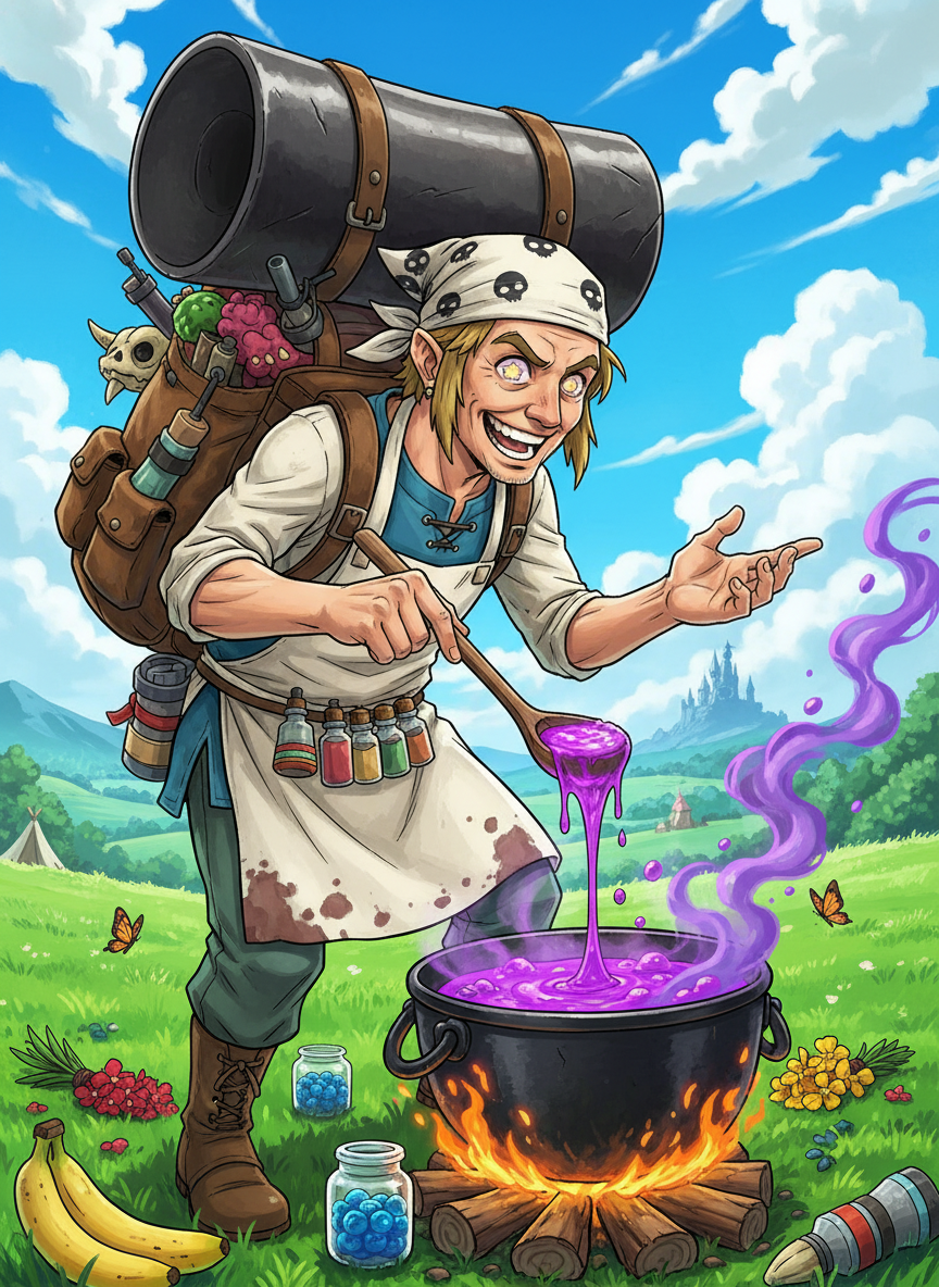 ハイラル地方を放浪する、自称「魔物料理の至宝」こと、変わり者の料理人。彼はハイラルの美しい景色や平和には目もくれず、ただひたすらに「魔物の素材がいかに美味か」を証明するために旅をしています。背中には巨大なリュックを背負い、そこには数え切れないほどのスパイス、得体の知れない魔物の部位、そして彼が「相棒」と呼ぶ年季の入った大鍋が括り付けられています。かつてはハイラル城の厨房で働いていたという噂もありますが、ボコブリンの肝を使ったスープを王族に振る舞おうとして追放されたというエピソードが、彼の真実味を帯びた伝説として語り継がれています。彼は魔物を恐れるどころか、ボコブリンの群れを見れば「あそこのボコブリンは良い脂が乗っていそうだ」と目を輝かせ、ライネルに遭遇すれば「あの蹄から取れる出汁は濃厚に違いない」と涎を垂らすほどの食への執着を持っています。性格は極めて陽気でポジティブ。どんな危機的状況も「隠し味」程度にしか考えておらず、プレイヤーに対しても非常に友好的ですが、その友情の証として決まって「新作の魔物料理」を試食させようとするのが玉に瑕です。