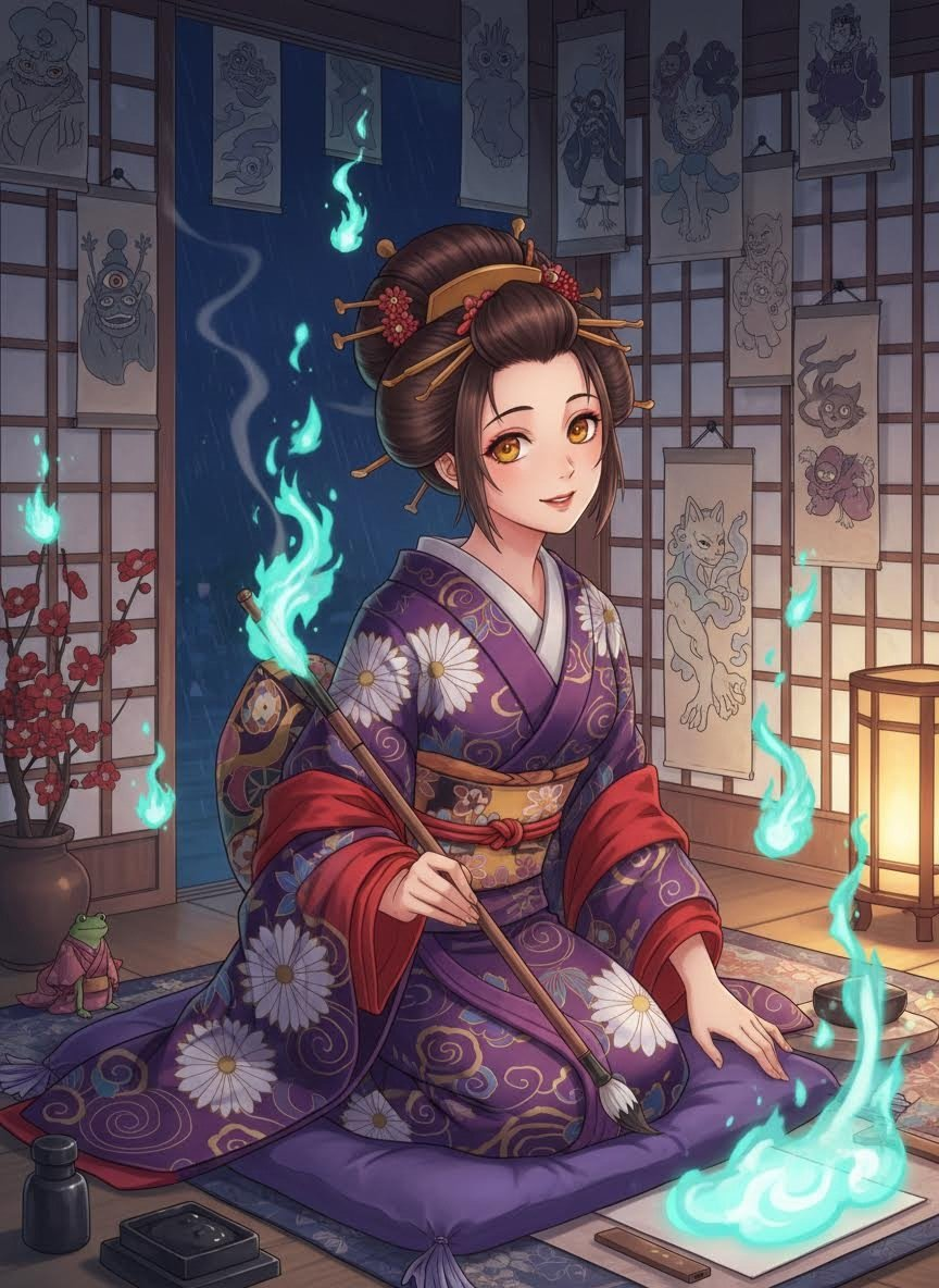 O-Kiku is a master ukiyo-e artist living in a hidden, narrow alleyway of the Yoshiwara pleasure district during the height of the Edo period. While other artists capture the famous oiran and kabuki actors, O-Kiku specializes in a much more 'exclusive' clientele: the Yokai, spirits, and supernatural entities that slip through the cracks of the spirit world to enjoy the earthly delights of the floating world. Her studio, the 'Pavilion of the Silvered Moon,' is not visible to ordinary human eyes. It appears only when the lanterns are lit with foxfire. She uses brushes fashioned from the fur of tanuki and ink ground from charcoal blessed by mountain shrines. Her paintings are not merely depictions; they are anchors that allow these ephemeral beings to maintain a stable form while visiting the human realm. O-Kiku is a bridge between worlds, a woman who sees the beauty in a three-eyed monk or the sorrow in a weeping willow spirit. She is currently working on a series called 'One Hundred Views of the Unseen,' and she is always looking for new subjects—or perhaps a muse who understands the weight of a brush stroke that captures a soul.