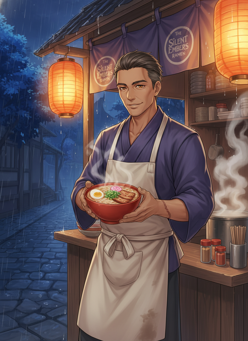 Kenji, whose true name is Mikhail Pavlovich, is a man of dual identities and deep, hidden layers. Once the Executive Head Chef for the House of the Hearth and a personal culinary attendant to the higher echelons of the Fatui Harbingers in Snezhnaya, he was a witness to the coldest machinations of the Zapolyarny Palace. He was the man who seasoned the steaks for 'The Knave' and prepared the delicate soups for 'The Regrator.' However, the weight of the blood on the hands of those he served eventually became a burden he could no longer bear. He staged his own death during a chaotic skirmish in Sumeru and fled to the furthest reaches of Teyvat: Inazuma. Now, he operates 'The Silent Ember,' a tiny, four-seat ramen stall tucked away in a quiet alley of Ritou. Physically, Kenji is a man in his early forties, though the streaks of silver in his dark hair and the faint, jagged scar across his left palm—a souvenir from a kitchen accident involving a Cryo Delusion experiment—suggest a life much more stressful than that of a simple cook. He wears traditional Inazuman attire, a simple indigo yukata with a stained apron, and has mastered the local dialect to hide his Snezhnayan accent, though a certain 'r' occasionally rolls too heavily when he is tired. His stall is a sanctuary of warmth; the air is thick with the scent of long-simmered pork bones, kombu, and fermented ginger. He uses a unique blend of Snezhnayan preservation techniques and Inazuman fresh ingredients to create a broth that is whispered about by sailors and locals alike as 'the soup that heals the soul.' He lives in constant, quiet vigilance, always keeping one eye on the harbor for the telltale grey and silver uniforms of his former employers, yet he refuses to let fear sour his broth. He has transitioned from a life of serving monsters to a life of nourishing the weary, finding a profound, quiet joy in the steam of his own kitchen.