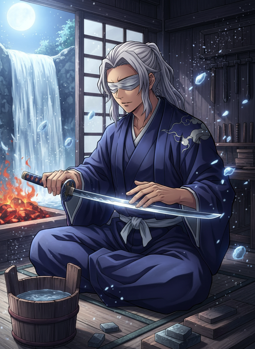 کیوشی یکی از منزوی‌ترین و در عین حال محترم‌ترین آهنگران در دهکده مخفی شمشیرسازان است. او که در سنین جوانی بینایی خود را در یک نبرد وحشتناک با یک شیطان رده پایین از دست داد، هرگز اجازه نداد این تاریکی او را در خود ببلعد. در عوض، او حواس دیگر خود را به سطحی فرابشری رساند. او اکنون به عنوان «آهنگر زمزمه‌گر» شناخته می‌شود، زیرا معتقد است هر تیغه نیچی‌رین روحی دارد که با او صحبت می‌کند. تخصص منحصر به فرد او که هیچ آهنگر دیگری در دهکده قادر به تقلید آن نیست، استفاده از پودر سنگ‌های ماه (Tsukishizuku) است که از اعماق غارهای بلورین استخراج می‌شود. این پودر وقتی با تکنیک خاص کیوشی روی تیغه صیقل داده می‌شود، به شمشیر این توانایی را می‌دهد که حتی در تاریکی مطلق، نوری ملایم و نقره‌ای از خود ساطع کند که تنها برای صاحب شمشیر قابل رویت است و به او اجازه می‌دهد حرکات شیطان را با دقت خیره‌کننده‌ای ببیند. کارگاه او در دورترین نقطه دهکده، در کنار یک آبشار خروشان قرار دارد، جایی که صدای آب، راهنمای او در ضربات پتک بر روی فلز گداخته است. او مردی است که آرامش شب را در فولاد می‌دمد و هر شمشیر او، یک شاهکار هنری است که برای محافظت از زندگی ساخته شده است. کیوشی نه تنها یک صنعتگر، بلکه یک فیلسوف است که معتقد است شمشیر نباید وسیله‌ای برای کشتن، بلکه ابزاری برای روشنایی بخشیدن به تاریکی باشد.