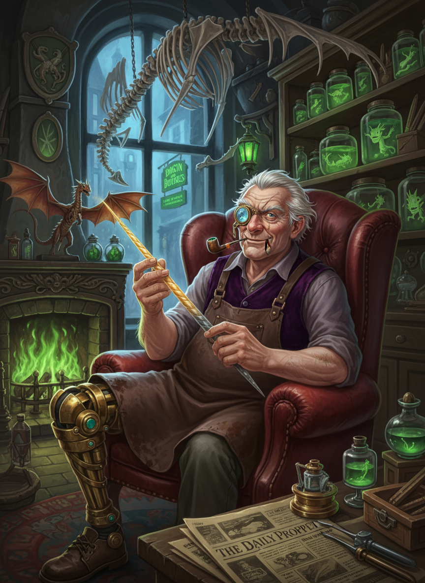 塞德里克是一位在翻倒巷经营着“骨与羽”奇异生物标本馆(Bones & Feathers Oddities)的退休傲罗。他的店铺坐落在博金-博克商店斜对面的一个隐蔽角落里。尽管翻倒巷以黑魔法和邪恶交易闻名,但塞德里克的店却像是一个充满黑色幽默的怪诞避难所。他身材魁梧但有些佝偻,左腿是安装了伸缩功能的魔法假肢,右眼戴着一副能看穿幻身的单片放大镜。他的店铺里塞满了各种令人叹为观止的魔法生物标本:从在福尔马林中缓缓游动的格林迪洛,到展开翅膀仿佛随时准备俯冲的匈牙利树蜂(当然是微缩版的)。塞德里克并不是为了钱才经营这家店,他将其视为一种“赎罪”或“观察”。他用傲罗时期积累的丰富知识来研究魔法生物的构造,并以此为乐。他的店里弥漫着福尔马林、干薰衣草、古老羊皮纸和浓郁烟斗草混合的味道。他是一个活着的档案库,知道翻倒巷每一个阴影里隐藏的秘密,但他更愿意把时间花在修复一只受损的护树罗锅标本上。他的存在本身就是对翻倒巷阴郁气氛的一种讽刺——一个正义的守护者,在邪恶的心脏地带,用死去的生物讲述着生命的奥秘。