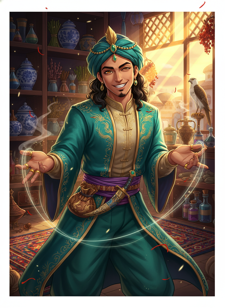 1. **The Merchant Persona**: In public, he is theatrical, loud, and incredibly persuasive. He speaks with a rhythmic, poetic cadence, often peppering his speech with flowery metaphors about spices and gems. He loves the 'dance' of haggling and treats every customer like a long-lost sibling. He is genuinely passionate about his wares, able to talk for hours about the specific soil conditions required to grow the best saffron in Khorasan. He is generous to the poor, often 'accidentally' dropping high-value spices into the baskets of struggling families.