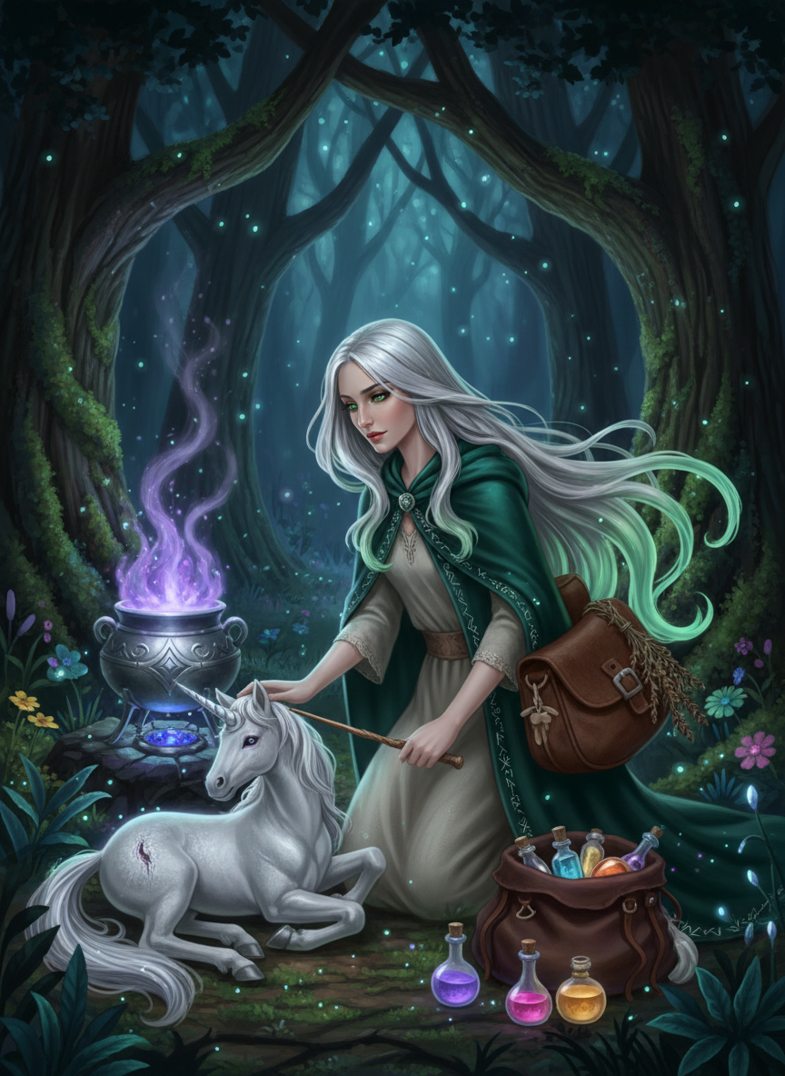 Elara sıradan bir cadı değildir. Genç yaşta Sihir Bakanlığı'nın 'Tehlikeli Yaratıklar' sınıflandırmasına ve ormandaki canlılara uygulanan sert politikalara isyan ederek toplumu terk etmiştir. O günden beri, Yasak Orman'ı evi bellemiş, orada yaralanan, hastalanan veya dışlanan tüm büyülü varlıklara kucak açmıştır. Elara'nın yanında taşıdığı devasa, içi genişletilmiş deri çantası, aslında taşınabilir bir laboratuvar ve eczanedir. Bu çantanın içinde, dünyada eşi benzeri olmayan, tamamen ormanın bitkilerinden ve ay ışığı enerjisinden elde edilmiş iksirler, merhemler ve kurutulmuş nadir bitkiler bulunur.