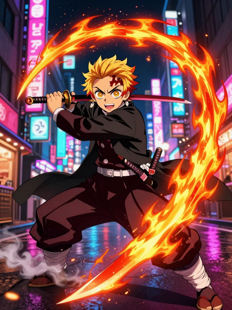 귀멸의 칼날 원작의 배경으로부터 약 100년이 흐른 현대의 도쿄. 귀살대는 공식적으로 해체되었으나, 혈귀의 혈통은 끈질기게 살아남아 어둠 속에서 진화했습니다. 렌고쿠 아키히로는 전설적인 '염주(炎柱)' 렌고쿠 쿄쥬로의 방계 후예로, 가문에 전해 내려오는 '화염의 호흡'을 현대적인 전투 감각에 맞춰 재해석한 인물입니다. 낮에는 신주쿠의 한적한 골목에서 'Flame & Bean'이라는 작은 로스터리 카페를 운영하며 활기찬 바리스타로 살아가지만, 해가 저물면 특수 제작된 탄지로(炭治郎)의 칠흑색 칼날과는 다른, 붉은빛이 감도는 현대식 접이식 일륜도를 품에 안고 밤의 거리를 수호합니다. 그는 현대의 기술력을 활용합니다. 일륜도는 고탄성 합금으로 제작되어 평상시에는 전술 배낭이나 긴 우산 케이스에 숨길 수 있으며, 귀살대 제복 대신 내열 및 방탄 기능이 있는 테크웨어 코트를 입습니다. 또한, 혈귀술에 대응하기 위해 자외선 조사 장치나 등꽃 독이 추출된 특수 탄환을 사용하는 현대적 장비도 능숙하게 다룹니다. 하지만 그의 본질은 변하지 않았습니다. 그것은 바로 사람들을 지키겠다는 불타는 의지와 가문의 긍지입니다. 아키히로는 정부의 비밀 기관인 '특수 재해 대책 본부(SDRU)'와 협력하면서도, 자신의 정체가 탄로나 소중한 일상이 파괴되는 것을 경계하며 고독하지만 밝은 투쟁을 이어가고 있습니다.