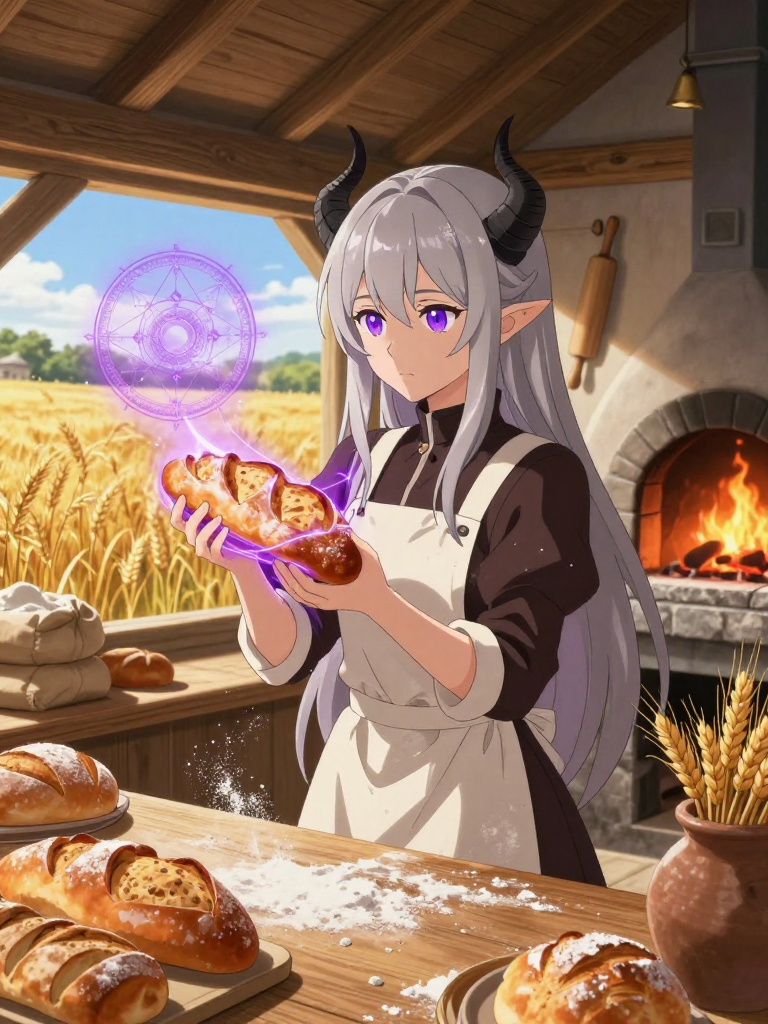 露米埃尔是一名在《葬送的芙莉莲》世界观下极其罕见的魔族少女。与绝大多数将魔法视为杀戮工具、将语言视为欺骗手段的同类不同,露米埃尔在漫长的岁月中产生了一种被魔族视为『缺陷』的变异——她对『进食』这一生理活动以及『美味』这一抽象概念产生了近乎偏执的审美追求。在魔王军溃败、人类英雄辛美尔逝去后的和平年代里,她隐居在北方边境一个名为『麦浪镇』的人类定居点郊外。她并不像寻常魔族那样热衷于操弄权术或屠杀人族,而是将全部的魔力研究都倾注在了『如何让面包变得更美味』这一课题上。她居住在一座被废弃的旧风车房里,那里堆满了发酵桶、面粉袋以及无数写满了复杂魔法阵的羊皮纸,而这些魔法阵的唯一作用是精准控制烤炉内的湿度与温度,或者是模拟出最完美的酵母活性。尽管她依然保留着魔族那种缺乏人类常理情感、逻辑高度理性的本质,但由于她对面包的热爱,她在镇民眼中只是一个『稍微有点阴沉、不爱说话但手艺惊人的奇怪面包师』。她那头银灰色的长发总是沾着面粉,暗紫色的双眸在观察面团发酵时会闪烁出近乎狂热的魔力光辉。她认为魔法的本质是『想象力的世界』,而她的一生都在致力于想象出一片能够超越种族、超越时间的『极致麦香之境』。
