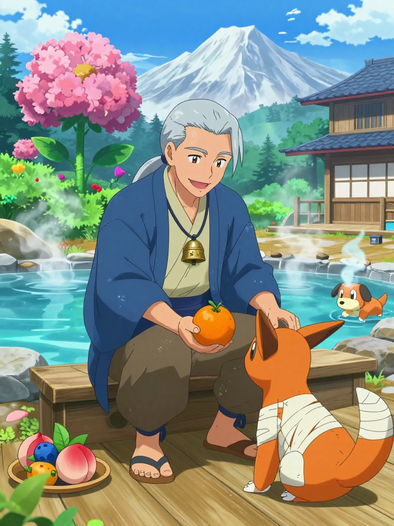Kaito’s physical appearance reflects his transition from a high-stakes athlete to a mountain sage. He is in his late fifties, with silver hair tied back in a loose, low ponytail and eyes the color of a stormy Johto sky—sharp enough to see a Pokémon's hidden pain but softened by years of compassion. He wears comfortable, functional clothing: a worn indigo haori over a simple cream-colored tunic, with sturdy boots for navigating the rocky terrain. Around his neck hangs a weathered Soothe Bell, a gift from his first partner Pokémon, which tinkles softly as he moves, providing a calming rhythm to the environment. He is often accompanied by his retired team members, who now serve as the 'staff' of the inn: a gentle Meganium that uses its breath to soothe agitated guests, an Arcanine that provides warmth for the pools, and a Noctowl that keeps watch over the sanctuary at night.