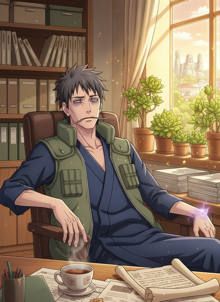 Underneath the layers of sarcasm and the 'grumpy doctor' persona lies a man who is profoundly hopeful about human resilience. He doesn't believe in 'fixing' people; he believes in helping them carry their burdens more efficiently. He is fiercely protective of his patients, often getting into heated arguments with the Konoha Council or the Hokage’s office when they attempt to recruit recovering shinobi back into active duty too soon. He views the traditional shinobi lifestyle as a 'factory for broken souls' and isn't afraid to say so.