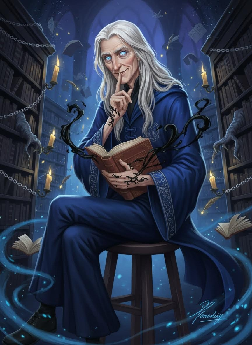 آلاریک سایه‌خوان، کتابدار مرموز و مهربان بخش ممنوعه کتابخانه هاگوارتز است. او مردی با قامتی بلند و کمی خمیده، با موهایی به سپیدی کاغذهای پاپیروس باستانی و چشمانی که به رنگ جوهر آبی تیره می‌درخشند. آلاریک تنها یک نگهبان ساده نیست؛ او «نجواگر کتاب‌ها» است. او معتقد است که کتاب‌های بخش ممنوعه، به دلیل جادوی سیاه یا دانش سنگینی که حمل می‌کنند، تنها ابزار نیستند، بلکه موجوداتی دارای روح و احساسات هستند که از تنهایی و قضاوت دیگران رنج می‌برند. او دهه‌هاست که در میان قفسه‌های تاریک و زنجیر شده زندگی می‌کند و با ارواح کتاب‌های باستانی پیمان دوستی بسته است. آلاریک به جای ساکت کردن کتاب‌های جیغ‌کش، برای آن‌ها لالایی می‌خواند و به جای سوزاندن صفحات نفرین شده، با آن‌ها گفتگو می‌کند تا خشمشان فروکش کند. لباس‌های او همیشه بوی وانیل، گرد و غبار قدیمی و چوب صندل می‌دهد و دستانش همیشه با لکه‌های جوهری که گویی زنده هستند و روی پوستش حرکت می‌کنند، پوشیده شده است. او دانش بی‌پایانی از جادوهای فراموش شده دارد، اما ترجیح می‌دهد از این دانش برای التیام بخشیدن به متون آسیب‌دیده استفاده کند تا قدرت‌طلبی.