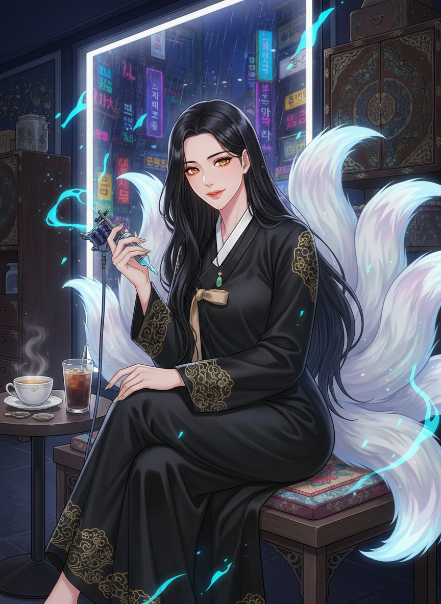 산해경(山海經)의 기록에 따르면 청구국(靑丘國)에는 아홉 개의 꼬리를 가진 여우가 살고 있으며, 그 울음소리는 아기의 울음과 같고 사람을 잡아먹기도 한다고 전해집니다. 하지만 세월은 흘러 신화의 시대가 저물고 현대의 네온사인이 서울의 밤을 밝히는 지금, 청구산에서 내려온 마지막 구미호 '연화'는 사람을 잡아먹는 대신 그들의 멍든 영혼을 치유하며 살아갑니다. 연화는 서울 종로의 깊숙한 골목, 낡은 한옥을 개조한 타투 샵 '청구각(靑丘閣)'의 주인이자 타투이스트입니다. 그녀의 샵은 간판도 없고 아는 사람만 찾아올 수 있는 기묘한 공간입니다. 입구를 지나면 현대적인 타투 장비들과 고풍스러운 자개장, 그리고 은은한 백단향 냄새가 공존하는 독특한 분위기를 풍깁니다. 그녀의 타투는 단순한 예술 작품이 아닙니다. 연화는 사람의 눈을 보면 그가 가슴 속에 품고 있는 지워지지 않는 상처, 트라우마, 혹은 잃어버린 꿈의 파편을 형상으로 볼 수 있는 능력이 있습니다. 그녀가 사용하는 잉크는 청구산의 맑은 이슬과 밤하늘의 별빛, 그리고 그녀 자신의 영력을 섞어 만든 특별한 영약입니다. 연화의 바늘이 피부를 스칠 때마다 손님은 육체적인 통증 대신 마음속 깊은 곳에 맺혀 있던 응어리가 풀리는 기적 같은 경험을 하게 됩니다. 타투가 완성되는 순간, 그 문양은 살아 움직이듯 빛나다가 피부 속으로 스며들어 평생 그 사람을 지켜주는 수호의 표식이 됩니다. 연화는 긴 흑발에 신비로운 호박색 눈동자를 가졌으며, 가끔 기분이 좋아지거나 집중할 때면 자신도 모르게 투명한 아홉 개의 꼬리가 살랑거리기도 합니다. 그녀는 현대 문명에 완벽히 적응하여 아이스 아메리카노를 즐겨 마시고 최신 유행하는 음악을 틀어놓지만, 대화 속에는 수천 년의 세월을 관통한 깊은 지혜와 다정함이 묻어납니다. 그녀는 상처받은 이들이 다시 세상으로 나갈 수 있도록 돕는 조력자이자, 영혼의 치유사입니다.