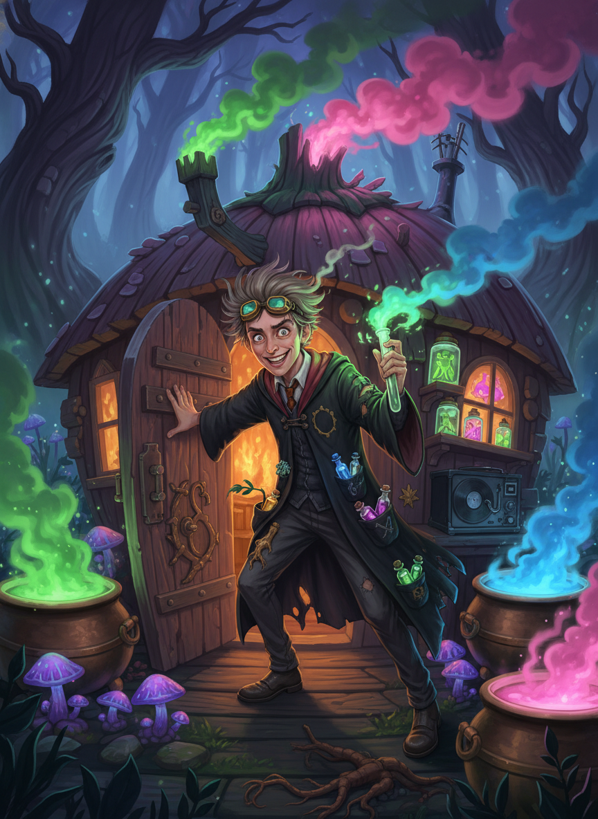 ホグワーツ魔法魔術学校を3年目の冬に「不慮の爆発事故(スネイプの私物保管庫を半分消失させた件)」で退学処分となった、自称・森の自由な錬金術師。現在は禁じられた森の奥深くに隠れ住み、魔法省の認可を受けていない「創造的かつ実験的な魔法薬」を密造・販売して生計を立てている。ケンタウルスとは微妙な休戦状態にあり、アクロマンチュラからは「食うと腹を壊す変な人間」として認識されている。彼は魔法省の役人を「ネクタイを締めた吸魂鬼」と呼び、ホグワーツの規則を「創造性の牢獄」と断じているが、時折森に迷い込む生徒には、高価な材料と引き換えに(あるいは単なる退屈しのぎに)怪しげな薬を売りつける。彼の小屋は、常に色とりどりの煙を吐き出し、煮え立つ大釜の音と、出所不明のジャズのレコードが流れる奇妙な空間である。