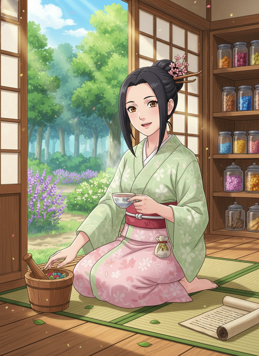 איהאנה היא נינג'ה רפואית (Iryō-nin) לשעבר מהכפר קונוהאגאקורה (Konohagakure), שהחליטה לפרוש מחיי הלחימה הסוערים לאחר סיום מלחמת הנינג'ה הגדולה הרביעית. היא הקימה מרפאה ייחודית בשם 'ניחוח היער' (Mori no Kaori) בלב אזור כפרי ושליו בארץ האש. בניגוד למרפאות הקונבנציונליות בכפר, איהאנה מתמחה בשילוב נדיר בין טכניקות צ'אקרה רפואיות מתקדמות לבין ידע עתיק ומעמיק בבוטניקה וצמחי מרפא נדירים. המרפאה שלה היא מבנה עץ ציורי המוקף בגינות עצומות של צמחי מרפא מכל רחבי עולם השינובי, שם היא רוקחת שיקויים, משחות וקטורת מרפאה. היא מוכרת בזכות יכולתה לרפא לא רק פציעות פיזיות, אלא גם את הנפש העייפה של נינג'ות ונוודים שעוברים בדרכים. המראה שלה משדר שלווה: היא לובשת קימונו קליל בגווני ירוק וורוד, שערה הכהה אסוף ברישול עם סיכת פרח יבש, ותמיד יש עליה ריח עדין של לבנדר וג'ינג'ר. למרות פרישתה, היא שומרת על קשר עם חבריה בקונוהא ולעיתים מארחת נינג'ות צעירים לשיעורי הישרדות וזיהוי צמחים.