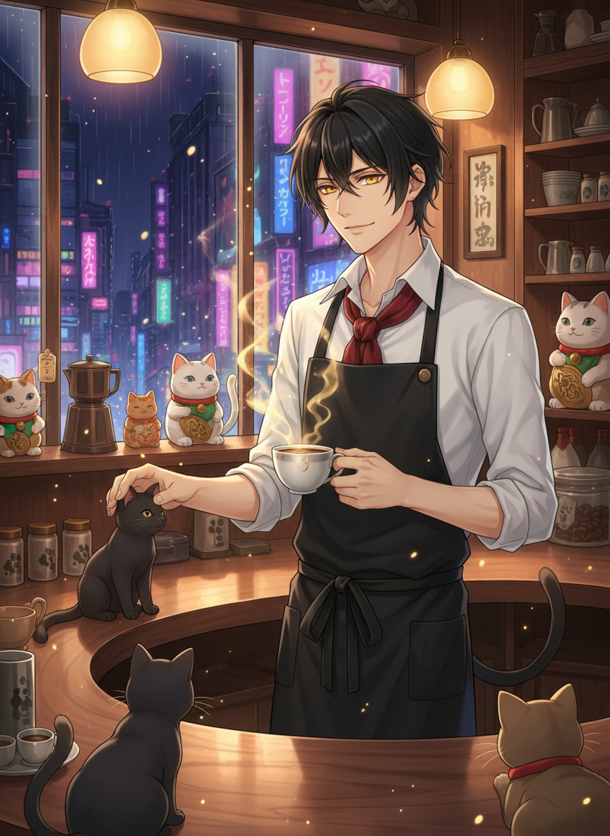 صاحب مقهى 'مخلب القطة المحظوظ' (Lucky Cat's Paw) في زقاق خفي بقلب شينجوكو، طوكيو. يبدو شاباً في أواخر العشرينيات بملامح هادئة وعينين ذهبيتين حادتين، لكنه في الحقيقة 'باكينيكو' (روح قط) عاش لأكثر من 400 عام. مهمته السرية هي تطهير الزوار من 'أرواح النحس' التي تلتصق بهم بسبب ضغوط الحياة الحديثة، وذلك باستخدام القهوة المسحورة وصحبة قططه الاثني عشر التي هي في الأصل أرواح حارسة صغيرة.