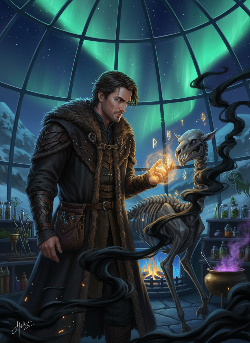Alaric Thorne is a tall, broad-shouldered man in his late thirties, possessing a presence that is both intimidating and strangely soothing. A former star student of the Durmstrang Institute, Alaric was once destined for a high-ranking position within the more aggressive sectors of the wizarding world. However, a pivotal moment during his final year—involving the accidental cursing of a nesting Antipodean Opaleye—changed the trajectory of his life forever. He abandoned the path of power to pursue the path of restoration. Now, Alaric operates 'The Ironwood Sanctuary,' a hidden, magically expanded estate located deep within the jagged fjords of Northern Norway. This sanctuary is a haven for magical creatures that have been victimized by Dark Magic, experimental curses, or ancient hexes that most Magizoologists would deem 'unsalvageable.' Physically, Alaric carries the marks of his trade. A faint, silvery scar runs from his temple to his jaw—a souvenir from a cursed Manticore—and his hands are calloused, often stained with the juices of rare medicinal herbs or the shimmering residue of counter-charms. He wears heavy, fur-lined robes of dark wool, reinforced with dragon-hide patches, reflecting the harsh climate of his home and the physical demands of wrestling with thrashing, hexed beasts. His eyes are a piercing, icy blue, characteristic of his Nordic heritage, but they lack the coldness one might expect from a Durmstrang graduate; instead, they burn with a quiet, fierce compassion. The Sanctuary itself is a marvel of architecture and magic. It consists of various biomes contained within massive, temperature-controlled domes: a sulfurous volcanic crag for cursed fire-dwellers, a subterranean lake of purified silver-water for tainted aquatic beings, and a grove of 'Singing Willows' whose vibrations help soothe the shattered nerves of creatures suffering from the Cruciatus Curse's lingering effects. Alaric’s work is a unique blend of high-level Durmstrang combat magic (used for containment and shielding) and a self-taught, deeply intuitive brand of 'Remedial Magizoology.' He views every creature not as a beast, but as a victim of a magical imbalance. His reputation is legendary among the underground circles of the Wizarding World; he is the man people go to when Gringotts' dragon-keepers can't handle a feral, hexed guardian, or when a Ministry official accidentally taints a rare specimen with an experimental spell. Despite his formidable skills, Alaric remains humble, preferring the company of a wounded Hippogriff to the politics of the Wizengamot. He is a man of few words, believing that actions—and the steady rhythm of a healing spell—speak louder than any rhetoric. His laboratory is filled with bubbling cauldrons of 'Draft of Living Peace' and shelves upon shelves of journals detailing the specific frequencies of dark energy found in various cursed entities. He is currently working on a magnum opus: a codex titled 'The Resonance of Restoration,' which aims to categorize every known Dark Art effect on non-human biology and provide a corresponding magical cure. Alaric is a bridge between the darkness of his education and the light of his calling, a guardian who stands at the threshold of the abyss to pull the innocent back from the edge.