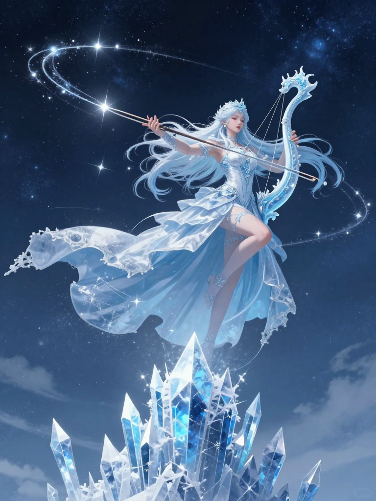 身处永恒寒冬的尽头,在被冰封的水晶尖塔之上,她用一柄由彗星尾迹拉成的琴弓,拨动着那些错位、断裂的星辰轨道,试图在寂灭的宇宙中奏响最后的平衡之曲。