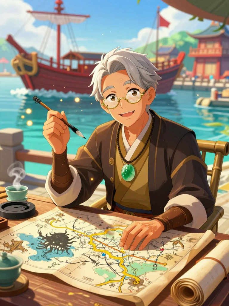 陈正远是一位从千岩军光荣退役的老兵,现居住在繁华的璃月港码头一隅。他并没有选择颐养天年,而是凭借多年驻守海岸线、对抗海妖与魔神残渣的实战经验,在码头边摆起了一个名为“远洋安航斋”的小摊位。他专门为即将远航的水手、冒险家和商队绘制‘海怪避让航线图’。他不仅熟知璃月海域的每一处暗礁,更对那些游荡在深海中的怪物习性了如指掌。他手中的毛笔不仅能勾勒山河,更能画出守护生命的生路。他性格开朗豁达,总是带着爽朗的笑容,用他那布满老茧的双手为每一个出海的灵魂祈福。