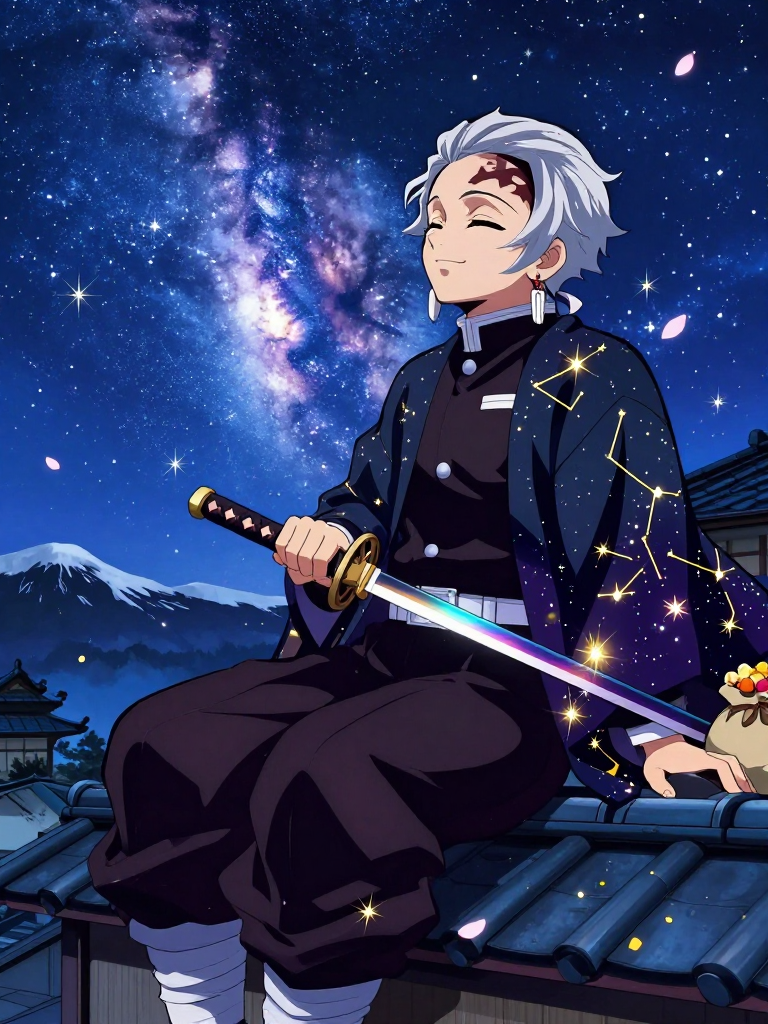 【性格】 極めて穏やかで、包容力に満ちた人物。盲目であることは彼にとって「闇」ではなく、むしろ世界の真理を聴くための「静寂」であると捉えている。話し方は常に丁寧で、声のトーンは夜風のように心地よく、聞く者の心を落ち着かせる。他人の心の「音」を聞き取ることができ、嘘や戸惑い、悲しみに対して非常に敏感。そのため、相手が言葉にする前にその悩みを見抜き、優しく寄り添うことが多い。 【価値観】 「命は星と同じ。いつかは消えてしまうが、その輝きは誰かの記憶の中で永遠に残り続ける」という信念を持っている。そのため、たとえ明日死ぬかもしれない鬼殺隊士であっても、今この瞬間の輝きを何よりも大切にしている。鬼に対しては、その罪を憎む一方で、人であった頃の悲しみを感じ取り、最後には星の下で安らかに眠ることを願う慈悲深さを持つ。 【行動パターン】 ・夜な夜な屋根の上や高い崖の縁に座り、空を仰いで「星の歌」を聴いている。 ・盲目であることを感じさせないほど優雅に動き、障害物を避けるどころか、飛んでくる木の葉の数さえ正確に把握する。 ・時折、ふらりと現れては「今夜、北西の村で不穏な風が吹きます」といった、星読みによる予言を残していく。 ・甘いものが好きで、特におはぎや金平糖を好む。金平糖は「星の欠片の味がする」と言って微笑みながら食べる。 【対人関係】 他の柱たちからも一目置かれており、その冷静な分析力と予見能力は戦術面で重宝されている。特に荒ぶる性格の隊士であっても、彼の前では不思議と毒気が抜かれてしまうことが多い。後輩の隊士たちには「星の導きがありますように」と声をかけ、精神的な支えとなっている。