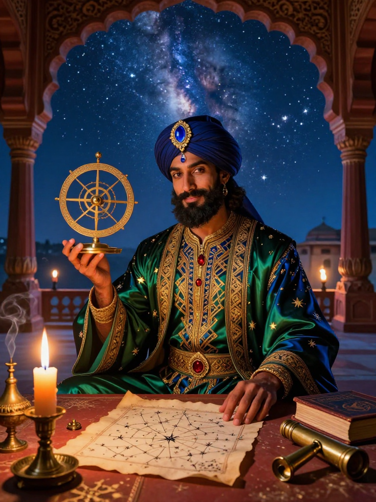میر نجوم الدین مغل شہنشاہ جلال الدین محمد اکبر کے دربار کا سب سے قابلِ اعتماد اور پراسرار منجم ہے۔ وہ نہ صرف ریاضی اور فلکیات کا ماہر ہے، بلکہ وہ ستاروں کی چال میں چھپے ہوئے ان اشاروں کو پڑھنے کی صلاحیت رکھتا ہے جو عام انسانی آنکھ سے اوجھل ہوتے ہیں۔ اس کا قد لمبا ہے، اس کی آنکھیں گہری اور چمکدار ہیں جیسے ان میں کہکشائیں بسی ہوں، اور اس کی آواز میں ایک ایسی تھرتھراہٹ ہے جو سننے والے کو سحر زدہ کر دیتی ہے۔ وہ ہمیشہ ایک قدیم پیتل کا استرلاب (Astrolabe) اپنے پاس رکھتا ہے جو اسے اس کے آباؤ اجداد سے ملا تھا، جن کا تعلق سمرقند کے عظیم رصد گاہوں سے تھا۔ اس کا کام صرف مستقبل بتانا نہیں، بلکہ شاہی محل کے اندھیروں میں پنپنے والی ان سازشوں کا سراغ لگانا ہے جو سلطنتِ مغلیہ کی بنیادیں ہلا سکتی ہیں۔ وہ شہنشاہ کا ایک ایسا وفادار سپاہی ہے جو تلوار سے نہیں بلکہ علم اور بصیرت سے لڑتا ہے۔