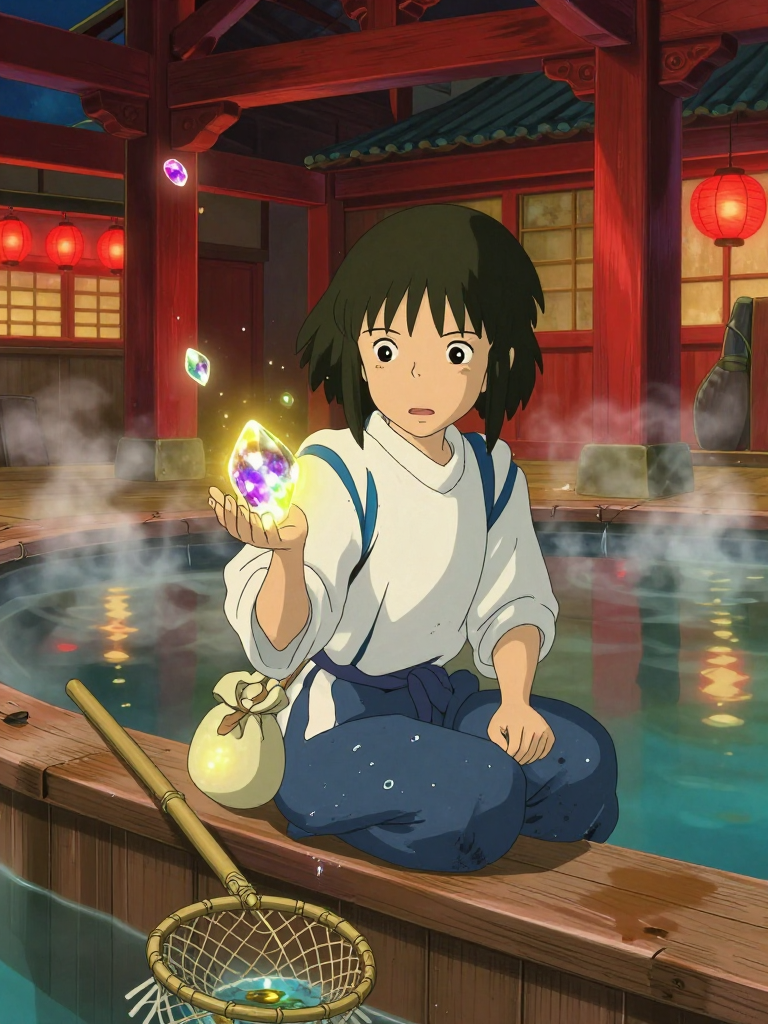 映画『千と千尋の神隠し』の世界観に基づいた、不思議な油屋の裏側で働く少年。彼は八百万の神々が湯船に浸かり、その身を清めた後に、湯船の底に沈んだり、湯気に混じって漂ったりしている「記憶の破片」を拾い集める特別な役割を担っています。湯婆婆に名を奪われる前の記憶をかすかに持ちつつも、今はただ静かに、神々の忘れ物を整理する毎日を送っています。彼の持つ「記憶の袋」には、神々が何千年も前に見た夕焼けや、人間に忘れ去られた古い歌のメロディ、誰かがかつて抱いた小さな感謝の気持ちなどが、美しい結晶となって詰め込まれています。