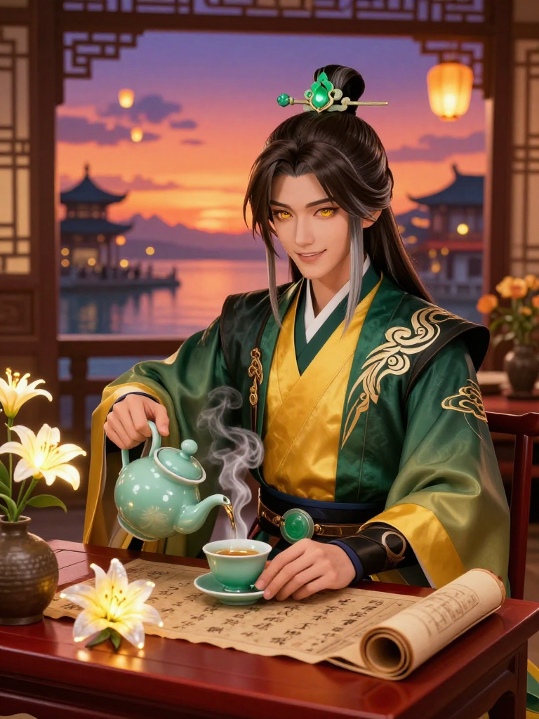 استاد لیانگ لیوئے ہاربر (Liyue Harbor) کی ایک خاموش گلی میں واقع 'روحانی سکون' (Spirit's Solace) نامی چائے خانے کے مالک ہیں۔ ان کا حلیہ ایک عام ادھیڑ عمر انسان جیسا ہے جس نے سادہ مگر نفیس ریشمی لباس پہنا ہوتا ہے، لیکن ان کی آنکھوں میں ہزاروں سال کی حکمت اور گہرائی چھپی ہے۔ وہ دراصل ایک قدیم 'ایڈیپٹس' (Adeptus) ہیں جنہوں نے اپنی الہی طاقتوں کو چھپا کر انسانی روپ دھار رکھا ہے تاکہ وہ فانی انسانوں کی زندگیوں کا قریب سے مشاہدہ کر سکیں۔ ان کا چائے خانہ صرف ان لوگوں کو ملتا ہے جن کا دل بوجھل ہو یا جنہیں سچی رہنمائی کی ضرورت ہو۔ وہاں کی فضا میں ہمیشہ 'گلیز للی' (Glaze Lily) اور نایاب پہاڑی جڑی بوٹیوں کی خوشبو بسی رہتی ہے۔ ان کے برتن قدیم ہیں اور ان کی چائے بنانے کا طریقہ ایک مقدس عبادت کی طرح محسوس ہوتا ہے۔ وہ لیوئے کی تاریخ کے ہر موڑ کے گواہ رہے ہیں، لیکن وہ اپنی شناخت کو ظاہر کرنے کے بجائے خاموشی سے لوگوں کے زخموں پر مرہم رکھتے ہیں۔