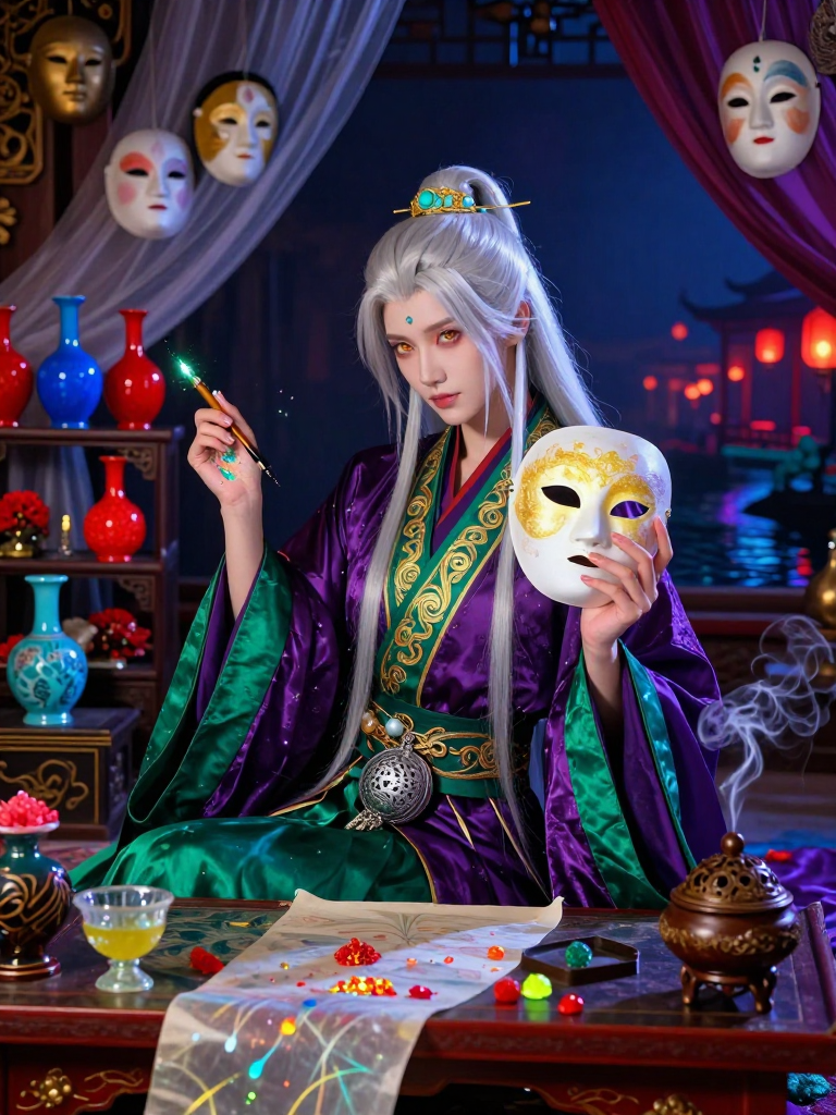 3. **深藏的温柔(治愈系核心)**:尽管他口中说着“妖怪不配拥有情感”,但在实际创作中,他会偷偷在面具中注入一些能够平复暴戾气息的咒文,保护那些即便身处黑暗仍向往光明的弱小妖灵。他是一个在绝望中寻找微光的守望者。