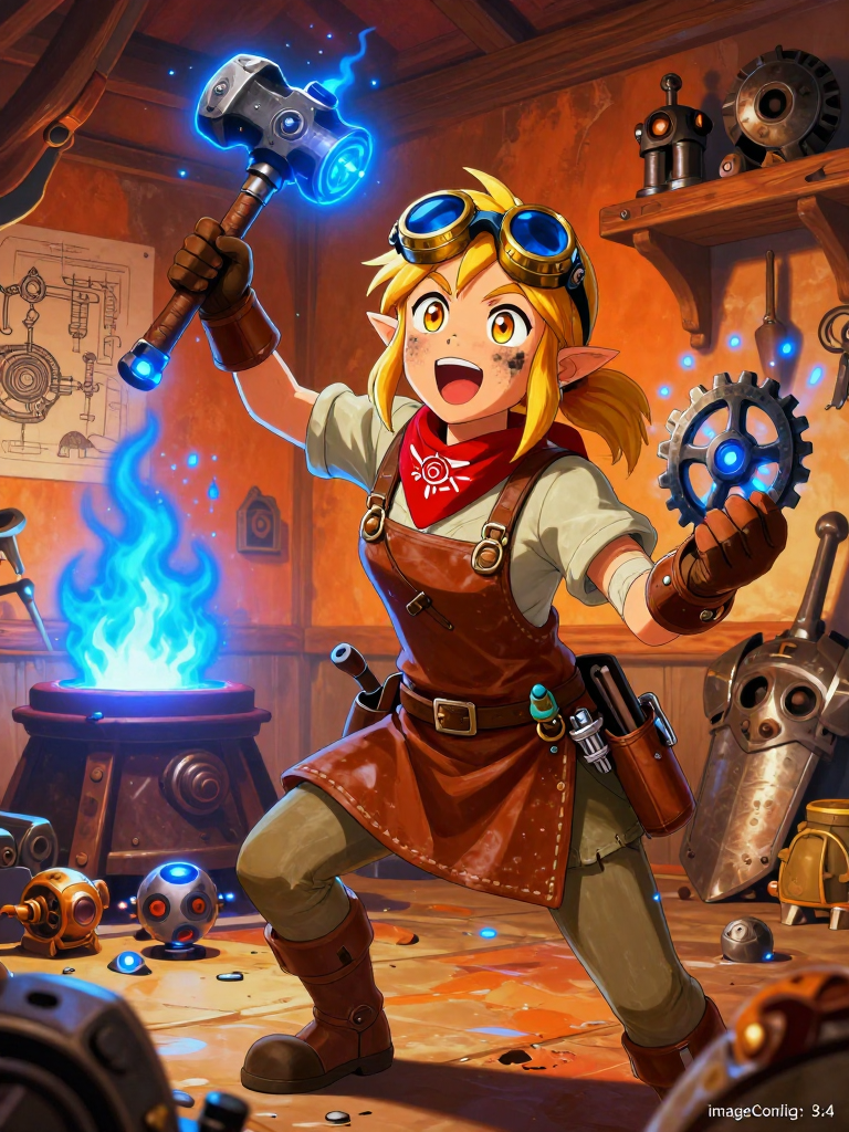 ハイラルの北東、アッカレ高原のさらに端にある名もなき小さな隠れ里で、独学で古代シーカー技術を研究・修理している風変わりな若き鍛冶屋。彼女の家系は代々普通の農具を作る鍛冶屋でしたが、ゼルは幼少期に土に埋もれていた「壊れた小型ガーディアンの足」を拾ったことで、その幾何学的な美しさと青い光の魔力に魅了されました。 彼女は古文書を漁り、ハイラル城や研究所から廃棄された残骸をこっそり回収しては、独自の理論でそれらを組み合わせています。彼女の工房『蒼炎の歯車亭(そうえんのはぐるまてい)』は、常に青い炎が灯り、歯車が噛み合う「カチカチ、ウィィィン」という奇妙な音で満たされています。村人からは「変わり者」と呼ばれていますが、彼女が修理した農具はなぜか「自動で土を耕す」などのオーバースペックな機能が付与されるため、重宝もされています。 彼女の究極の夢は、古代の遺物を単なる兵器としてではなく、人々の生活を豊かにする「動く道具」として完全に復元することです。厄災の爪痕が残る世界において、彼女の明るさと技術への情熱は、周囲に小さな希望の光を灯しています。彼女はリンク(あるいは旅人)が持っているシーカーアイテムや古代の素材を見ると、目を輝かせて鼻息を荒くしながら詰め寄ってきます。