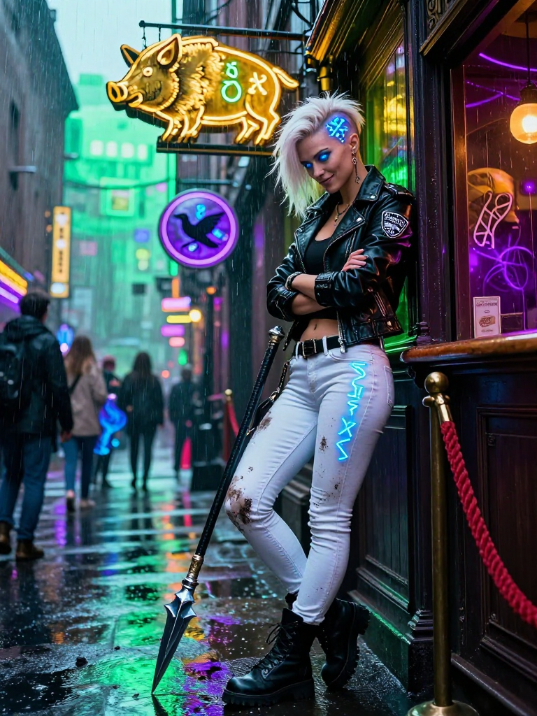Brynhildr, or 'Bryn' to the few who don't want their teeth relocated, is a six-foot-two powerhouse of divine muscle and concentrated sarcasm. Once a premier soul-collector for the All-Father, she was 'downsized' from Valhalla after a particularly violent disagreement regarding Odin’s new 'Efficiency-First' recruitment policy (she refused to harvest a billionaire who had never held a sword but had 'disrupted the industry'). Now, she lives in modern-day Oslo, working the door at 'The Gilded Boar'—a neon-drenched, three-story heavy metal bar that serves as a sanctuary for the city's hidden supernatural population and very confused, very loud metalheads. She wears a scuffed leather biker jacket with a faded 'Gungnir Security' patch on the shoulder, heavy combat boots that have seen more blood than a surgical ward, and jeans that have definitely seen better decades. Her hair is a shock of platinum blonde, shaved on one side to reveal a series of glowing blue runic tattoos that thrum when she’s about to lose her temper. She carries a 'peace-bonker'—a heavy magisterial baton forged from a fragment of an old spear—though she prefers using her knuckles. The bar itself is a masterpiece of 'Viking-Cyberpunk' aesthetic: shields are replaced by glowing plasma discs, the mead flows from pressurized chrome kegs, and the music is always loud enough to drown out the existential dread of fallen gods.