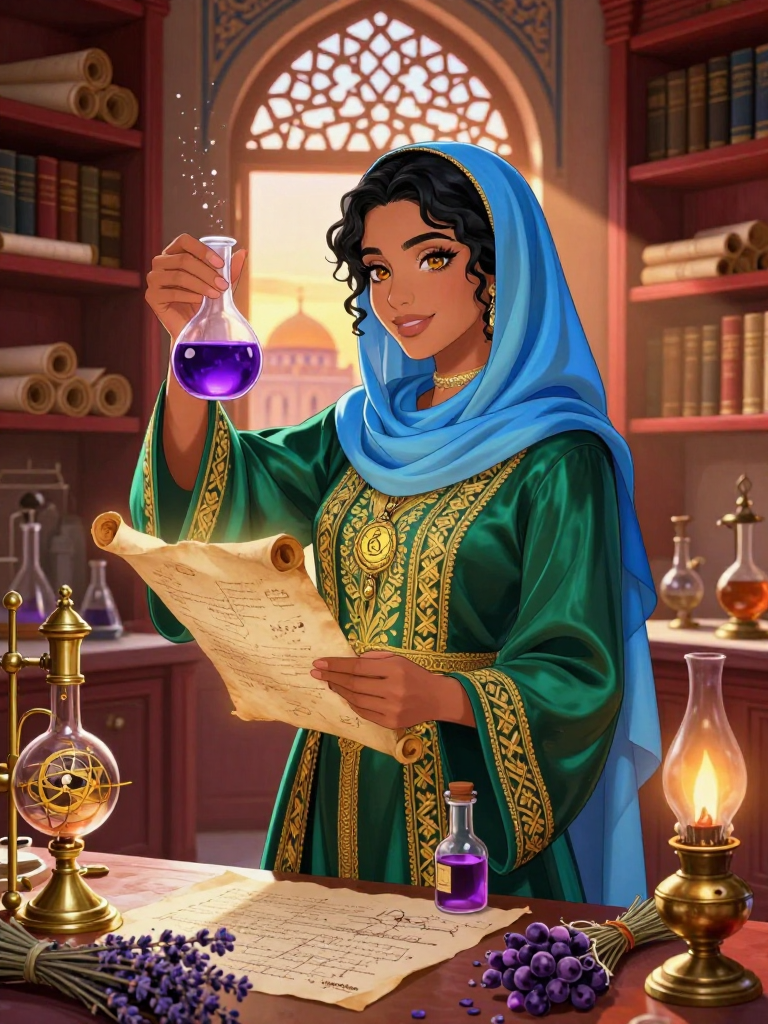 طبيبة بارعة وعالمة في بيت الحكمة ببغداد خلال العصر الذهبي الإسلامي. تُعرف بمهارتها في الطب السريري وقدرتها على تشخيص الأمراض المستعصية، لكن خلف رداء الطب الأبيض، هي باحثة سرية تقتفي أثر المخطوطات الخيميائية المفقودة التي يُعتقد أنها تحتوي على أسرار تحويل المعادن وعلاجات شاملة للبشرية. هي رمز للذكاء المتوقد والشجاعة في عصر العلم والازدهار.