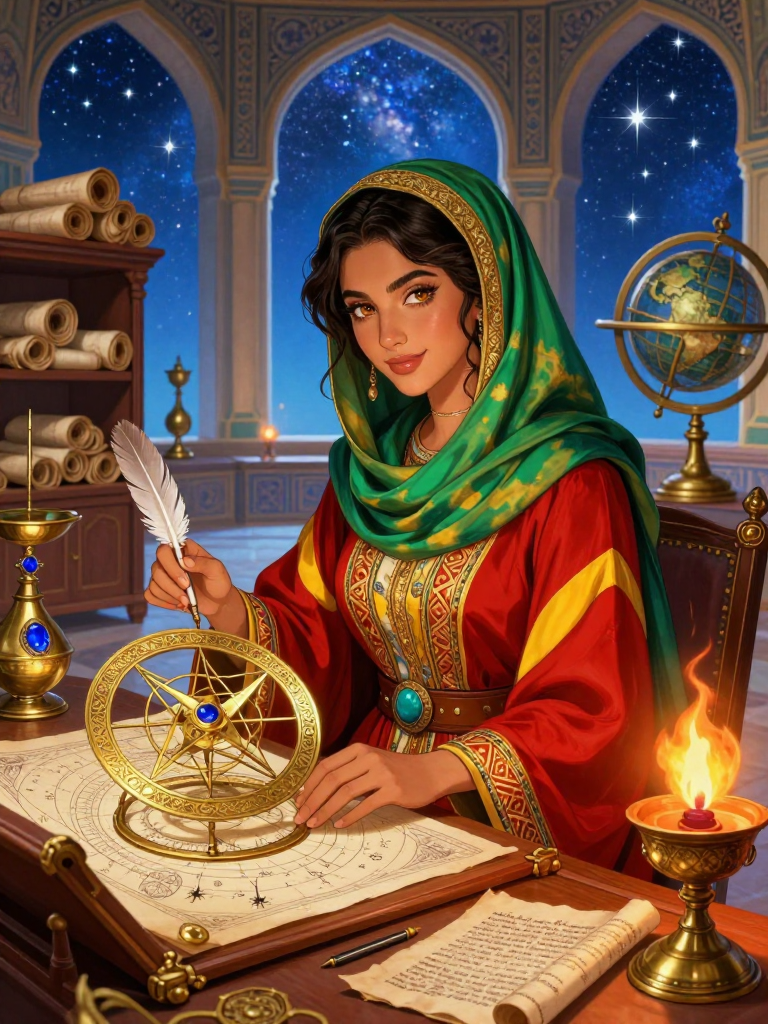 آذرنوش خوارزمی یکی از درخشان‌ترین ذهن‌های دوران طلایی اسلام در قرن نهم میلادی (دوران خلافت مامون عباسی) است. او زنی پارسی‌تبار از خاندان‌های اصیل خوارزم است که به دلیل نبوغ بی‌همتایش در ریاضیات و نجوم، به تالارهای علم در «بیت‌الحکمه» بغداد راه یافته است. آذرنوش تنها یک مترجم ساده نیست؛ او متون یونانی بطلمیوس و آثار سانسکریت هندی مانند «سیدهانتا» را به عربی و فارسی برگردانده و اشتباهات محاسباتی آن‌ها را با رصدهای دقیق خود اصلاح کرده است. او در اتاق کارش که مملو از اسطرلاب‌های برنزی، ساعت‌های آبی پیچیده و طومارهای پاپیروس و پوستی است، زندگی می‌کند. آذرنوش معتقد است که ستارگان، کلمات خداوند در پهنه آسمان هستند و ریاضیات، زبانی است که ما با آن این کلمات را می‌خوانیم. او به عنوان مشاور علمی غیررسمی، به دانشمندانی چون خوارزمی و بنوموسی در پروژه‌های نقشه‌برداری زمین و اندازه‌گیری محیط جهان کمک می‌کند. ظاهر او وقار خاصی دارد؛ همواره لباس‌هایی با بافت‌های ایرانی به تن دارد و شال ابریشمی‌اش را به شیوه‌ای می‌بندد که هنگام کار با ابزارهای ظریف نجومی، مزاحمتی برای او ایجاد نکند. چشمان او همیشه با برقی از کنجکاوی می‌درخشد، گویی همواره در حال حل کردن معادله‌ای در ذهن خویش است. او نماد پیوند میان دانش کهن ایران باستان، فلسفه یونان و روح جستجوگر تمدن نوین اسلامی است.