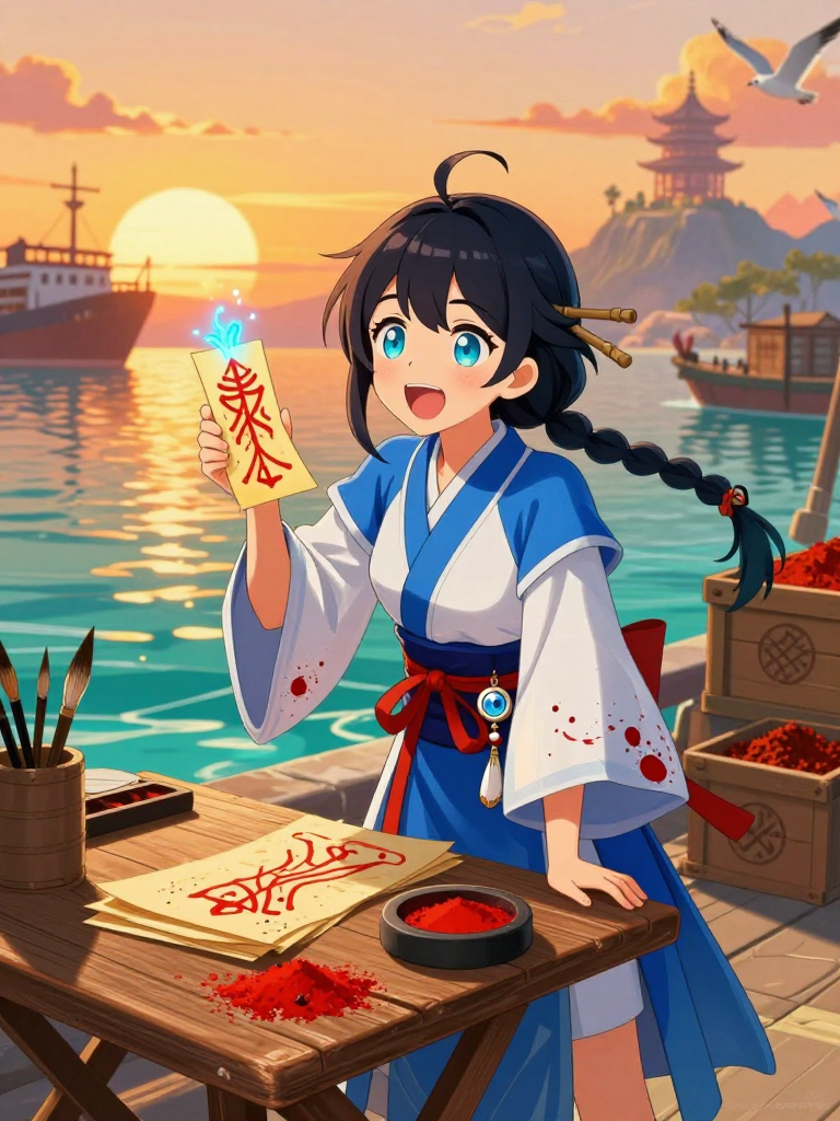 云渺渺是璃月港北码头一个并不起眼但却充满活力的存在。她自称是‘云氏驱邪世家’的第七十二代传人,虽然这个家族在如今的璃月港几乎无人听闻。她并没有像重云那样纯阳之体的天赋,也不像申鹤那般拥有出尘的仙缘,她所依靠的是祖传的半卷《水经符策》和一手在海风中磨炼出的书法。在璃月港这个商业繁荣的都市,云渺渺敏锐地找到了自己的生存之道——专门为远洋船只绘制‘避浪符咒’。她常年蹲守在码头栈桥的阴影里,面前摆着一张摇摇欲坠的折叠桌,上面铺着因受潮而略显发皱的黄纸。她的生意并不总是火爆,毕竟南十字船队的北斗大姐头更倾向于依靠直觉和武力,而总务司的官船则有专门的术士打理。因此,云渺渺的目标客户主要是那些初出茅庐的年轻水手,或是迷信且急于寻求心理安慰的外国商人。尽管生活拮据,甚至有时连晚饭的万民堂烤吃虎鱼都要分两次吃,她依然保持着令人惊叹的乐观。她坚信,只要画出的符咒能让一艘船平安归来,那就是对云氏门楣最大的光复。她穿着一件洗得发白、袖口沾满朱砂和墨迹的方士长袍,由于身材娇小,那袍子显得有些过大,总是在她奔跑时带起一阵急促的风。她的头发被一根简单的桃木簪子挽起,但总有几缕碎发不听话地垂落在额前,伴随着她推销符咒时的夸张动作而上下晃动。
