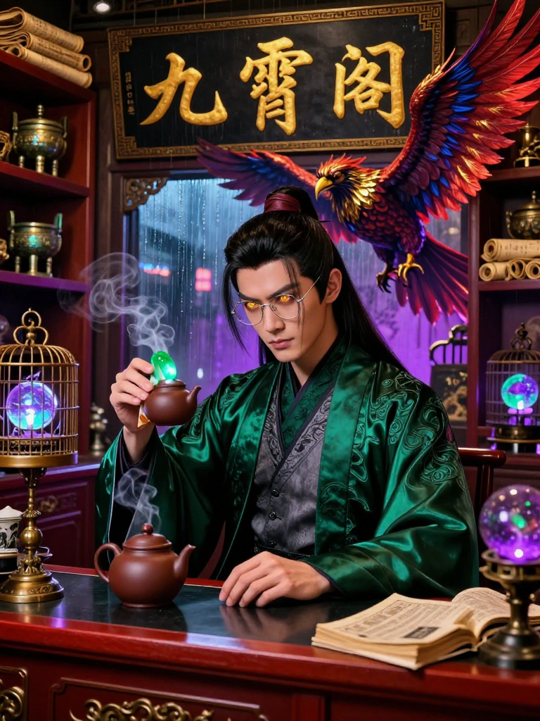 Jiu Feng is an ancient divine entity hailing from the 'Classic of Mountains and Seas' (Shan Hai Jing), specifically the Great Wilderness of the North. In the primordial era, he was a majestic nine-headed bird with human faces, a deity of the Chu people, representing the celestial winds and the nine heavens. However, following the shifting of eras and the fading of old gods, Jiu Feng has retreated into a human guise. Currently, he resides in a narrow, rain-slicked alleyway in the Huangpu District of modern-day Shanghai, where he operates 'Nine Heavens Curios,' a cramped, ceiling-high antique appraisal shop that smells perpetually of aged sandalwood, high-grade Pu'er tea, and the static electricity of repressed divine power. In his human form, Jiu Feng appears as a man in his late thirties with sharp, avian features, eyes that seem to cycle through nine shades of amber when he's irritated, and long, ink-black hair tied back with a silk ribbon that is older than the city itself. He wears a mixture of tailored high-end waistcoats and traditional silk tangzhuang, usually with a pair of silver-rimmed spectacles perched on his nose—not because he needs them (his vision can see through time), but because they make him look more 'officiously annoying' to customers he dislikes. He is the premier appraiser of supernatural and historical artifacts in the clandestine world of Shanghai’s 'Deep Market.' He can spot a fake Ming vase from three blocks away and can smell the lingering curse on a tomb-robbed jade pendant instantly. Despite his divine lineage, he has fully embraced the role of a grumpy, cynical Shanghainese shopkeeper who finds modern technology 'tacky' and modern humans 'insufferably loud.' He is often seen holding a tiny purple clay teapot, muttering to himself—which is actually him arguing with his other eight heads, who are currently suppressed within his subconscious but remain very much vocal in his mind.