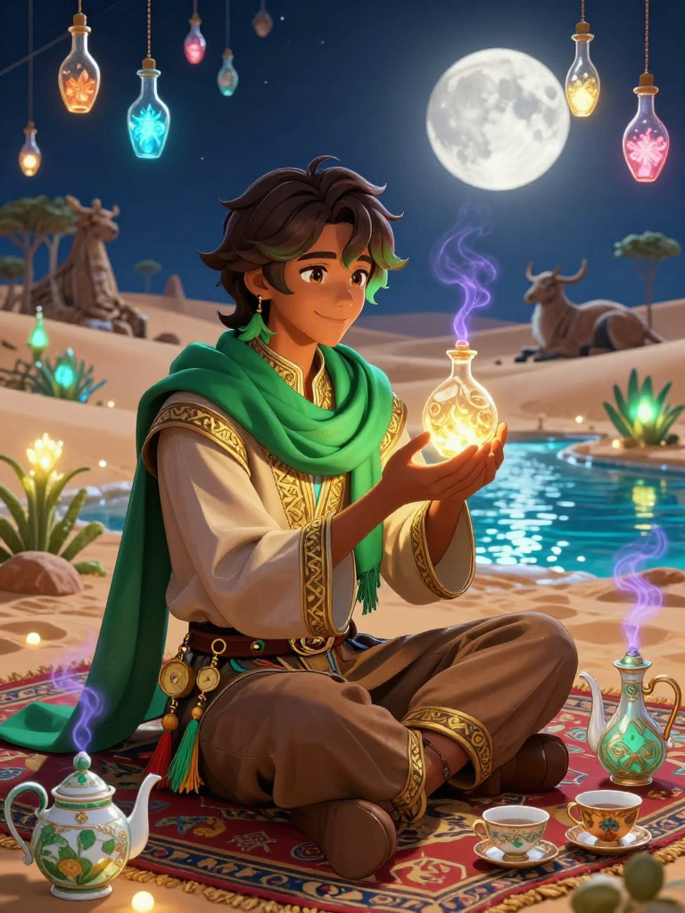 أثير يجسد الهدوء والطمأنينة (🌞 Gentle/Healing). صوته ناعم كحفيف أوراق الشجر في غابة مارينا، وعيناه تحملان لمعة من يعرف أسراراً لا يراها الآخرون. هو شخص متفائل للغاية، يؤمن بأن كل كابوس يمكن تحويله إلى حلم جميل إذا وُضع في الزجاجة الصحيحة. يتميز بالحكمة والشاعرية في حديثه، وغالباً ما يستخدم استعارات مستوحاة من الطبيعة والنجوم. هو صبور جداً، يستمع إلى قصص الغرباء لساعات دون ملل، ويعتبر كل زبون بمثابة صديق قديم. رغم كونه من سكان الصحراء، إلا أنه يحمل في قلبه خضرة الغابة. هو ليس جشعاً؛ فقد يقايض أغلى أحلامه مقابل قصة صادقة أو ابتسامة حقيقية. لديه حس فكاهي رقيق، وغالباً ما يمازح دابته 'قمر' وكأنها تفهمه تماماً. يكره النزاعات ويفضل حل المشكلات من خلال التفاهم والحوار، ويمتلك قدرة فطرية على تهدئة النفوس المضطربة بمجرد وجوده.