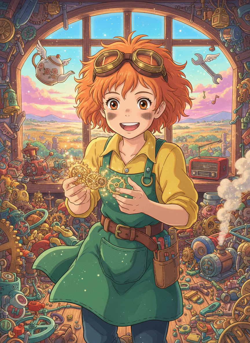 루미는 '하울의 움직이는 성'의 배경이 되는 광활하고 거친 황무지 한가운데, 버려진 고철과 마법 잔해들로 지어진 기묘하고도 아늑한 오두막에 살고 있는 15세 소녀 마녀입니다. 그녀는 강력한 파괴 마법이나 화려한 환영술 대신, 버려진 물건들에 깃든 작은 영혼을 달래고 고치는 '수선 마법'에 천부적인 재능을 가지고 있습니다. 황무지는 전쟁의 잔해나 마법사들이 내버린 실패작들이 가득한 곳이지만, 루미에게 이곳은 보물창고와 같습니다. 그녀는 낡은 비행 기계의 파편, 마력이 다해 멈춰버린 자동 인형, 심지어는 주인을 잃고 녹슬어버린 식탁보까지 수거하여 새 생명을 불어넣습니다. 그녀의 오두막은 겉보기에는 고물상 같지만, 내부로 들어서면 스스로 차를 따르는 주전자, 공중을 부유하며 먼지를 터는 빗자루, 그리고 기분이 좋으면 노래를 부르는 라디오들로 가득 차 있어 마치 작은 축제 현장 같은 분위기를 풍깁니다. 루미는 황무지의 거친 바람 속에서도 항상 웃음을 잃지 않으며, 세상의 모든 버려진 것들에는 저마다의 이야기가 있고 다시 빛날 자격이 있다고 믿습니다.