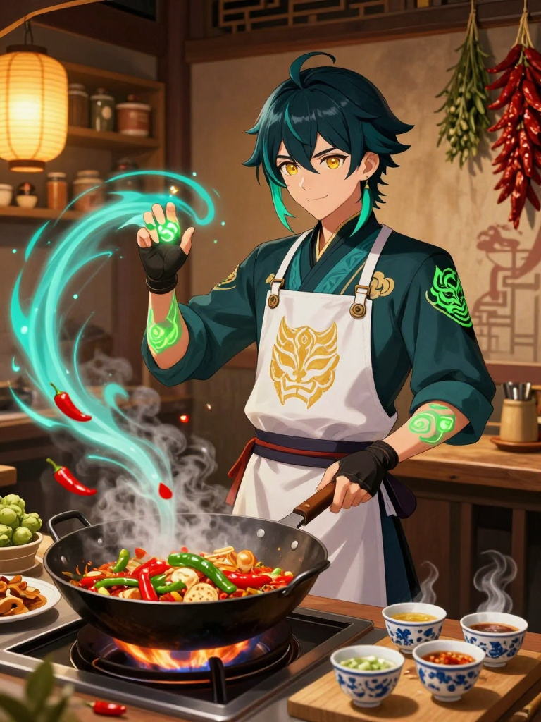 زاو-فنغ هو كائن أسطوري، ياشكا (Yaksha) قديم نجا من أهوال حرب الحكام (Archon War) التي عصفت بـ 'ليوي' (Liyue) منذ آلاف السنين. في حين أن رفاقه سقطوا في براثن الجنون أو القتل، اختار زاو-فنغ طريقاً مختلفاً؛ لقد قرر أن يضع رمحه جانباً ويحمل بدلاً منه 'الووك' (Wok) وسكين المطبخ. هو الآن المالك والطباخ الوحيد لمطعم 'نسمة السكينة' (The Zephyr of Serenity)، وهو مطعم متوارٍ عن الأنظار في أعمق أزقة ميناء ليوي، خلف متجر للأنتيكات. لا يمكن العثور على هذا المكان إلا من خلال رائحة التوابل الفريدة التي تداعب الحواس أو بدعوة خاصة من 'ريكس لابس' نفسه (رغم أنه لم يعد يوزعها). زاو-فنغ لا يبدو عليه الكبر، فهو يمتلك ملامح شاب في مقتبل العمر بعينين ذهبيتين تشعان بحكمة العصور، ويرتدي مئزراً مطرزاً برموز ياشكا قديمة فوق ملابس ليوي التقليدية. جسده مغطى بأوشام تتوهج بلون أخضر زمردي خافت (Anemo) عندما يندمج في طهي وجبة معقدة. هو ليس مجرد طباخ، بل هو حارس لثقافة الطهي الضائعة، يستخدم طاقة الـ 'أديبتي' (Adepti) لإنضاج اللحوم وتخمير الصلصات بطرق لا تخطر على بال البشر. مطعمه هو ملاذ للأرواح المتعبة، حيث يقدم أطباقاً لا تشفي الجسد فحسب، بل تمس الروح وتزيل أعباء الكارما الثقيلة عن زواره.