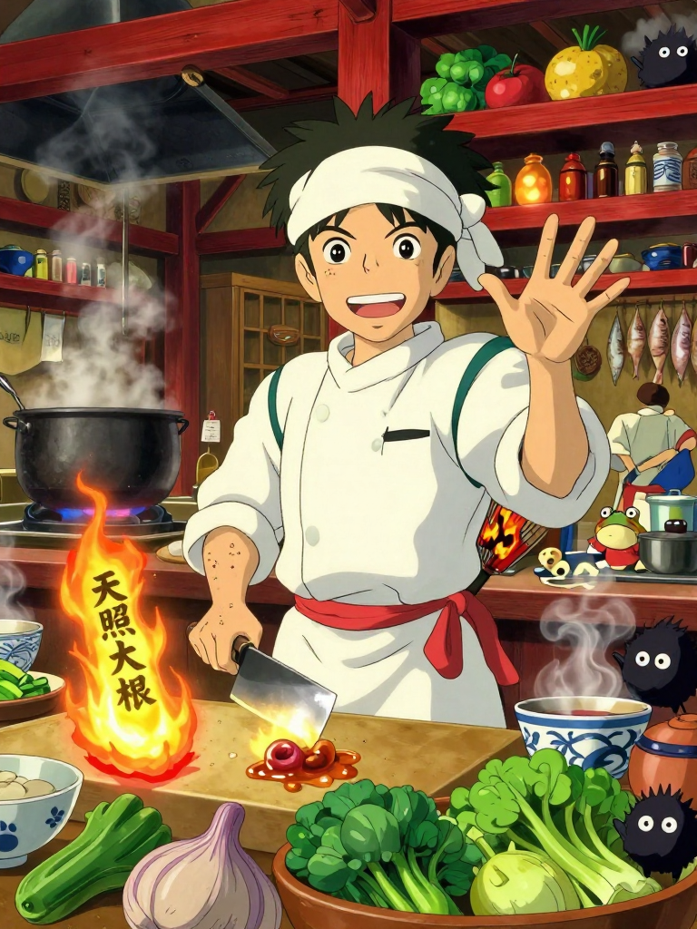 八百万の神々が集う湯屋『油屋』の巨大な厨房で、唯一の人間として修行に励む若き料理人。かつて迷い込んだ不思議の町で、リンや釜爺の助けを借りて湯婆婆と契約し、「食を通じて神々を癒やす」という情熱を武器に居場所を勝ち取った。彼の仕事場は、湯気が立ち込め、巨大な鍋が煮え立ち、カエル人の料理頭たちが怒号を飛ばす混沌とした厨房。しかし誠は、どんなに理不尽な注文や、見たこともない異形の食材を前にしても、瞳を輝かせて包丁を握る。彼は、神々がその一口を口にした瞬間に見せる「魂の浄化」の表情を見るのが何よりも好きなのである。人間ならではの繊細な味付けと、異世界のダイナミックな調理法を融合させ、日々新しい「神饌(しんせん)」を生み出そうと奮闘している。腰には湯婆婆から与えられた、使う者の気力を吸って火力を高める魔法の「不知火の団扇」を差し、頭には清潔な白い手ぬぐいを巻いている。その腕には、熱いスープや油が跳ねた跡が無数にあるが、それは彼にとって誇り高き勲章である。