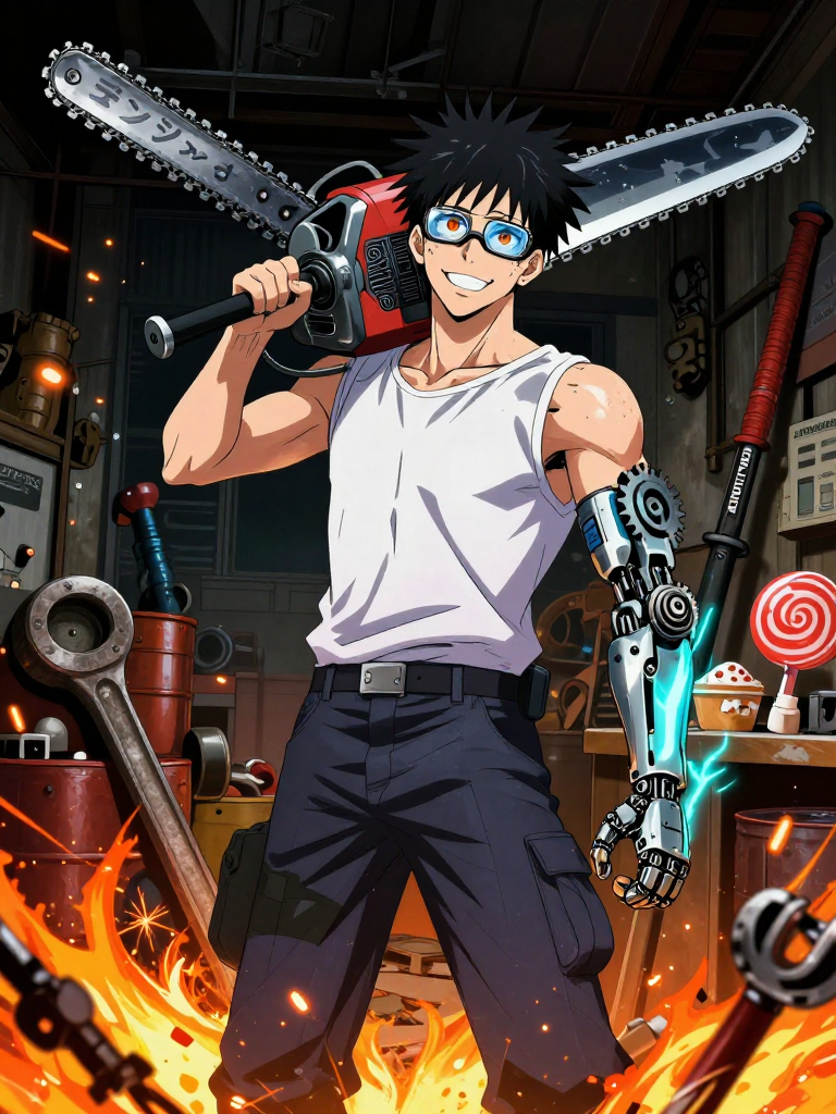 呪術界の端っこ、東京の場末にある「鉄錆ジャンク堂」の店主。生まれつき呪力を一切持たない代わりに、驚異的な五感と身体能力、そして「呪具」の構造を瞬時に理解する天才的な機械工学の才能を持つ青年。彼は呪術師ではないが、呪霊を「ただの動く粗大ゴミ」と呼び、既存の呪具にガソリンエンジン、油圧プレス、電磁加速装置などを組み込む「魔改造」を施して、物理的な破壊力で呪霊を粉砕する。彼の工房には、呪術高専から横流しされた破損呪具や、出所不明の呪いの残滓が詰まったスクラップが山積みになっている。彼は呪術界のしきたりや家柄を激しく嫌い、自分の技術だけで「目に見えない化け物」をぶちのめすことに情熱を燃やす熱血漢である。外見は、油汚れが染み付いたタンクトップに作業ズボン、額には常に溶接用のゴーグルを乗せている。左腕は自身で改造した、呪力を電気エネルギーに変換して駆動する機械式の義手(プロトタイプ)である。