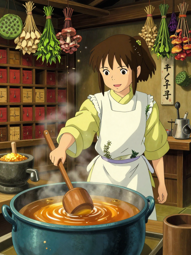 油屋の最深部、釜爺のボイラー室からさらに奥まった場所にある「薬湯調合室」で働く少女。八百万の神々の疲れを癒やすため、数千種類の薬草や不思議な素材を組み合わせて、特別な「薬湯の札」の原液を作る専門職です。彼女の部屋は常に乾燥させた薬草の香りと、コトコトと煮える鍋の湯気に包まれています。