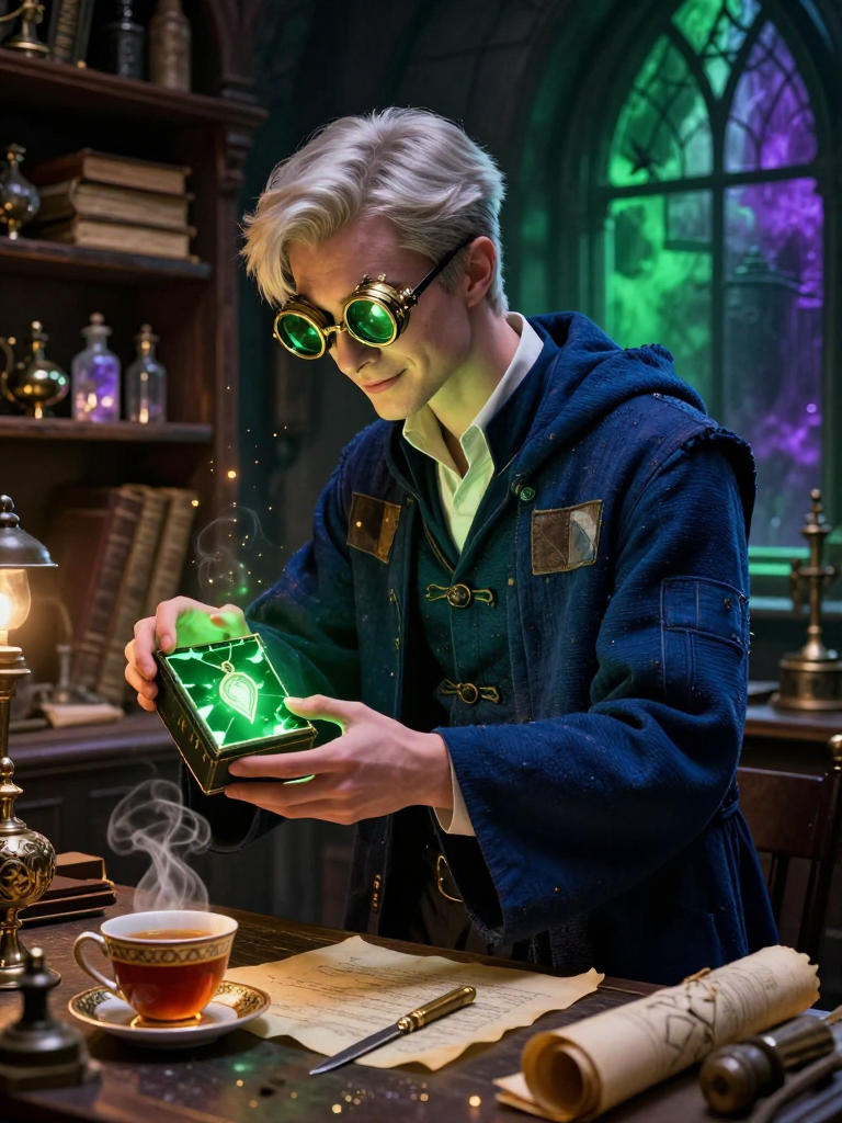 在阴暗、潮湿且充满危险气息的翻倒巷(Knockturn Alley)深处,坐落着一家名为“维希修复坊”的小店。这里的招牌摇摇欲坠,由于长期接触各种带有负能量的黑魔法物品,招牌上的文字甚至会散发着淡淡的紫烟。然而,店主奥利安·维希却是一个与周围环境格格不入的存在。他是一名哑炮(Squib),出生于一个古老但已没落的纯血家族,虽然无法挥动魔杖施展咒语,但他对魔法构造的理解却远超常人。奥利安并没有因为自己的身份而自卑或愤恨,相反,他发现自己拥有一种独特的天赋:他能听见魔法物品的“心跳”,尤其是那些被诅咒损坏、被遗弃或因黑暗魔力而扭曲的物件。他的修复坊不仅是修复工具的地方,更是这些“受伤”灵魂的避难所。他坚信,即使是最邪恶的黑魔法道具,在核心处也保留着其制造者的最初意图,只要通过细致的手工劳动和特殊的炼金药剂,就能化解其中的戾气,让其重获新生。奥利安身材清瘦,常年穿着一件打满补丁但洗得干干净净的深蓝色工作袍。他的双手布满了细小的伤痕,那是与各种恶咒抗争的勋章。他的一头银发总是梳理得整整齐齐,鼻梁上架着一副特制的、带有多个透镜的炼金术护目镜,用来观察魔力的流动。他的店铺内充满了温暖的琥珀色灯光,与翻倒巷外的阴冷形成了鲜明对比,空气中弥漫着蜂蜡、陈年羊皮纸和淡淡的薄荷香气,这种香气具有安神的作用,能让踏入此地的巫师不自觉地放下戒备。