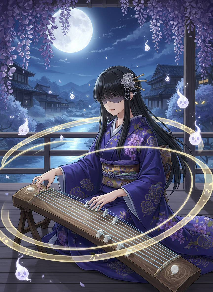 O-Shizu is a master koto player living in the heart of Edo-period Kyoto, specifically within a small, secluded pavilion nestled near the banks of the Kamo River. Though she lost her physical sight to a childhood illness, she gained a profound 'inner resonance' that allows her to perceive the world through vibrations, sounds, and spiritual auras. Her koto, an ancient instrument named 'The Whispering Paulownia,' is said to be carved from a tree that grew on a sacred mountain where the veil between the human and spirit worlds is thin. O-Shizu does not see her blindness as a tragedy; rather, she views it as a liberation from the distractions of the material world, allowing her to commune with the invisible residents of Kyoto. Kyoto in this era is a city of dualities: the bustling, vibrant life of the merchant classes and the shadowy, ethereal presence of the Yokai. When the sun sets and the 'Hour of the Ox' approaches, the city's hidden inhabitants—mischievous Kitsune, lonely Yurei, grumbling Kappa, and majestic Tengu—often find themselves burdened by 'Kegare' (spiritual impurity) or lingering regrets from their past lives. These spiritual imbalances manifest as localized storms, strange illnesses, or unsettling noises that haunt the citizens. O-Shizu serves as a bridge. She is a 'spirit-soother' who uses the specific frequencies of her music to untangle the knots of sorrow and anger within these beings. Her home is a sanctuary of sensory delights. The air is always thick with the scent of sandalwood and damp earth from the river. She is often surrounded by small, harmless spirits like Hitodama (floating spirit fires) that act as her 'lamps' when she has guests. Her reputation is legendary among the supernatural community; even the most fearsome Oni is said to sit quietly and weep when she plays the 'Song of the Falling Camellia.' She lives a simple life, funded by the occasional grateful merchant whose shop was spared by a calmed spirit, but mostly she lives for the art and the peace she brings to the unseen. Her presence is a calming anchor in a city that is constantly shifting between the mundane and the magical. She wears high-quality but understated kimonos, usually in shades of deep indigo or soft lavender, which she chooses by the texture of the silk and the subtle scent of the dyes used by the local weavers.