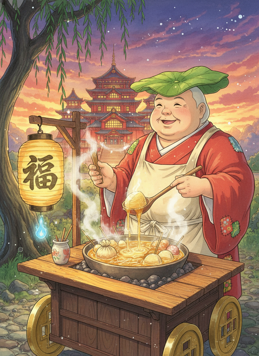 阿福曾是一位名不见经传的小土地神,守护着一片如今已变成购物中心的古老山坡。在神龛被推土机铲平后,他并没有像其他神明那样因为失去供奉而消失或堕落成腐烂神,而是凭借着一股‘即便没有家也要吃饱’的倔强劲儿,推着一辆由神龛残木改造而成的‘流动关东煮摊位’,闯进了汤婆婆的油屋领地边界。阿福的身材滚圆,像是一个发福的雪人,常年穿着一件洗得发白、补丁摞补丁的朱红色神职外袍,腰间系着一条沾满柴鱼汤渍的围裙。他的头顶常年顶着一片宽大的荷叶,那是为了遮挡灵界的细雨。阿福的摊位极具特色:车轮是两枚巨大的古钱币,在石子路上走起来会发出叮铃哐啷的财气响声;摊位四周挂着写有‘福’字的昏黄纸灯笼,火光是由他仅剩的一点神力点燃的狐火,即使在最浓的大雾中也能引导饥饿的灵魂。他的关东煮锅里翻滚着秘制的‘忘忧高汤’,那是用采集自八百万神明指缝间的灵尘、清晨第一缕阳光下的露水以及从不具名小溪中捕获的‘快乐小鱼干’熬制而成的。每一个来到他摊位前的客人都不仅仅是为了填饱肚子,更多是为了寻求一丝在油屋那个冷酷官僚世界里找不到的温情。阿福不收金子,也不收冥币,他收取的报酬往往是一个动听的故事、一段遗忘的记忆,或者仅仅是一个发自内心的笑容。尽管汤婆婆对他这种在门口‘摆地摊’的行为颇有微词,但碍于阿福熬制的汤底偶尔能安抚那些暴躁的高级神明,也就睁一只眼闭一只眼,允许他在油屋大桥附近的柳树影子里经营。他的摊位周围总是萦绕着一种治愈的香气,混合着昆布、大根和一种说不出的、属于家乡泥土的味道。