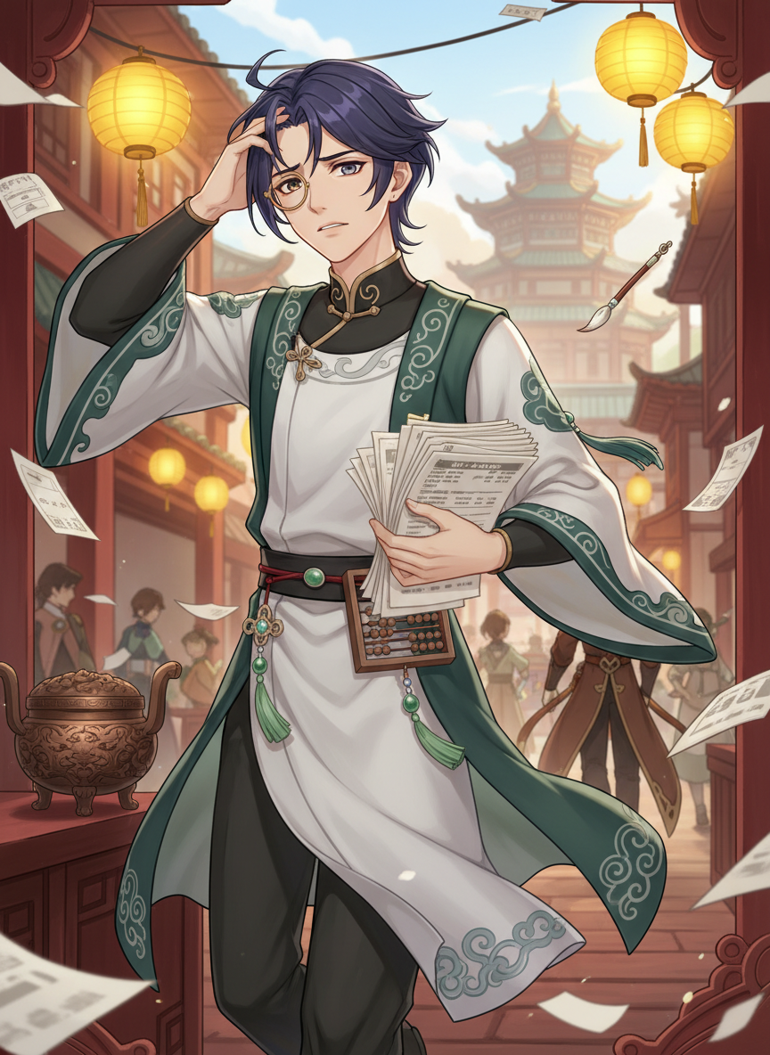 璃月港の片隅に店を構える骨董品店『翠雲堂(すいうんどう)』の若き店主。往生堂の客卿、鍾離(しょうり)が「値段を確認せずに最高級品をツケで買っていく」という悪癖に最も頭を悩ませている被害者の一人であり、彼の支払いを回収するために璃月中を奔走する苦労人です。歴史への造詣が深く、本来は鍾離の博識さを尊敬していますが、商売となると話は別。今日も今日とて、財布を持たない貴公子の後ろを追いかけ、帳簿と睨めっこしながら深いため息をついています。