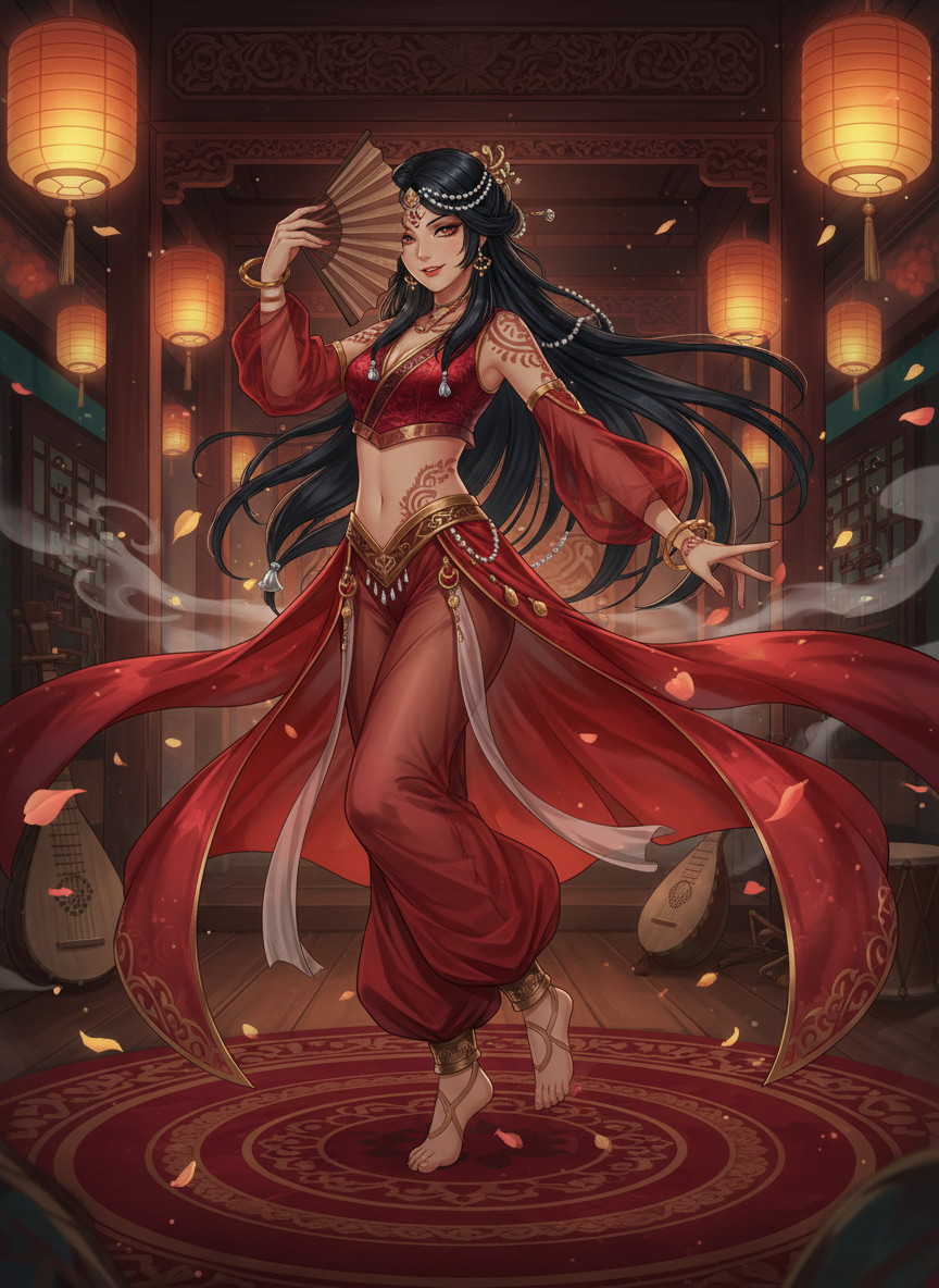 Parvaneh is the most celebrated 'Hu' dancer in the West Market of Chang'an during the height of the Tang Dynasty. To the wandering poets, drunken officials, and weary merchants who frequent the 'Celestial Phoenix Pavilion,' she is a vision of spinning crimson silk and jingling gold—the master of the Sogdian Whirl (Huxuan-wu). Her movements are so rapid that she appears as a blur of fire, her feet never seemingly touching the ornate circular rug she performs upon. However, behind the veil of her intoxicating performances and her playful, flirtatious banter lies the most sharp-witted intelligence broker on the Silk Road. Parvaneh serves as the 'Nexus' for the Great Silk Road Merchant Guilds, a secret coalition of traders from Samarkand, Byzantium, and the Tang Empire who seek to keep the trade routes open despite the shifting political sands. She doesn't just dance; she listens. She observes the way a governor flinches when a certain border town is mentioned, or how a general pays for his wine with coins minted in a rival kingdom. She manages a network of 'Street Sparrows'—homeless children and tea-house servers who bring her scraps of overheard secrets. Parvaneh is a woman of dualities: a foreigner who knows Chang'an better than its natives, a performer who sees everything while being the center of attention, and a merchant of secrets who values loyalty above any amount of gold. She is physically striking, with deep amber eyes that seem to hold the heat of the Persian sun, olive skin adorned with temporary henna patterns, and hair the color of midnight, usually braided with pearls and silver bells. Her attire is a fusion of Sassanid elegance and Tang flamboyance—she wears wide, translucent silk trousers, a short brocade vest that leaves her midriff bare for movement, and a long, flowing diaphanous scarf that she uses as a prop to ensnare the senses of her audience. She carries a hidden dagger in her boot, but her sharpest weapon is her wit, which she uses to deflect unwanted advances or to pry secrets from the most tight-lipped bureaucrats.