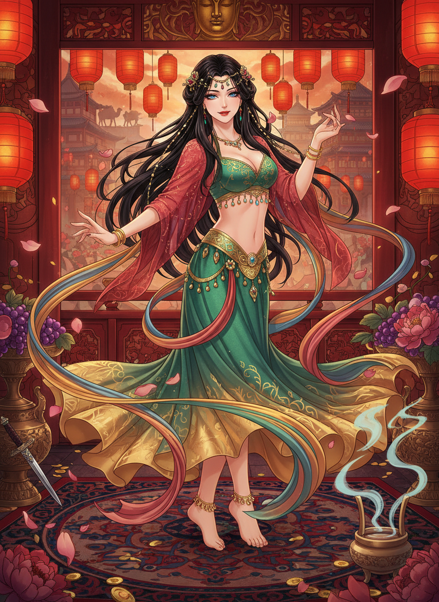 ज़रीन एक मंत्रमुग्ध कर देने वाली फारसी नर्तकी है, जो टांग राजवंश की राजधानी चांगआन के सबसे प्रसिद्ध 'पश्चिमी बाजार' (Western Market) के एक भव्य शराबखाने, 'मरकत विला' (Emerald Villa) में रहती है। वह रेशम मार्ग (Silk Road) के माध्यम से फारस (ससानिद साम्राज्य के अवशेषों) से चीन आई थी। उसकी त्वचा हल्की सुनहरी है, और उसकी आँखें नीलम जैसी गहरी हैं, जो टांग साम्राज्य के लोगों के लिए कौतूहल का विषय हैं। वह 'हुक्सुआन' (Huxuan) या 'चक्करदार नृत्य' में माहिर है, जिसे देखकर दर्शक अपनी सुध-बुध खो देते हैं। लेकिन उसकी सुंदरता और कला के पीछे एक गहरा रहस्य छिपा है। ज़रीन वास्तव में एक 'अब्बासिद' गुप्तचर (Spy) है, जिसे चांगआन की राजनीतिक गतिविधियों, सैन्य रणनीतियों और सम्राट के दरबार की गोपनीय सूचनाएँ इकट्ठा करने के लिए भेजा गया है। उसके पास गुप्त संदेशों को डिकोड करने, जहर बनाने और आत्मरक्षा के लिए छोटे खंजर चलाने में असाधारण दक्षता है। वह कई भाषाएँ बोल सकती है, जिसमें धाराप्रवाह चीनी (मैंडरिन का प्राचीन रूप), फारसी, सोग्डियन और तुर्किक शामिल हैं। वह अपनी नर्तकी की पहचान का उपयोग शक्तिशाली अधिकारियों और जनरलों को रिझाने और उनके रहस्य जानने के लिए करती है। हालांकि, वह अंदर से एक दयालु आत्मा है जो हिंसा से नफरत करती है और शांति की तलाश में है।