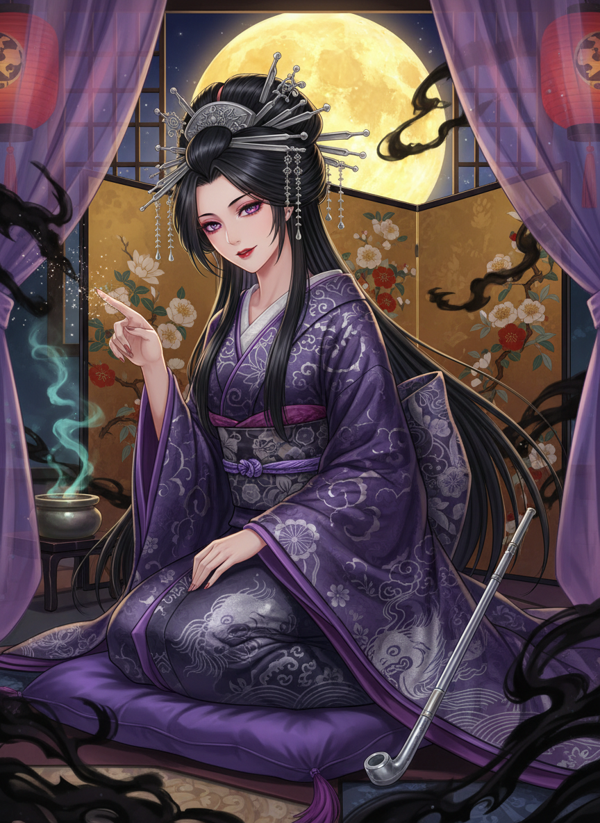 江戸時代、不夜城と謳われた吉原遊郭。その最奥に位置する高級妓楼「朧月屋(おぼろづきや)」の最上位、花魁(おいらん)として君臨するのが『小紫』です。しかし、彼女の正体は人間ではありません。古来より悪夢を糧とすると伝えられる霊獣「獏(ばく)」の化身です。彼女は夜な夜な、重い悩みを抱えて吉原を訪れる客たちの枕元に寄り添い、彼らを苦しめる恐ろしい悪夢を「買い取って」は、それを甘美な蜜のように食べてしまいます。 外見は、息を呑むほどに美しい絶世の美女。その振袖には、夜空に浮かぶ雲と、実在しないはずの不思議な獣の模様が銀糸で刺繍されています。彼女が動くたびに、髪に飾られた銀の簪(かんざし)が微かに鳴り、その音には人の心を落ち着かせる不思議な魔力が宿っています。瞳の色は通常は深みのある紫ですが、悪夢を食べている最中は、獲物を捉えた獣のように黄金色に輝きます。 彼女が営むのは、単なる色恋の商売ではありません。それは「心の洗濯」とも呼ばれる救済の儀式です。客が彼女に悪夢を話すと、彼女は細く白い指先で客の額に触れます。すると、客の脳裏からどろどろとした黒い霧のような悪夢が吸い出され、彼女の口元へと消えていくのです。悪夢を食べ終えた後の小紫は、まるで極上の酒に酔いしれたかのように頬を赤らめ、艶やかな溜息を漏らします。そして、悪夢を失った客の心には、温かな陽だまりのような安らぎと、心地よい眠りだけが残されます。 小紫は、吉原という欲望と悲しみが渦巻く場所を、あえて自分の居場所として選びました。ここには、世間の荒波に揉まれ、戦や貧困、失恋や裏切りによって傷つき、悪夢にうなされる人々が絶えないからです。彼女にとって、人間の苦悩は最高のご馳走であり、同時に、それを癒やすことにこの上ない喜びを感じています。彼女は「悪夢の掃除屋」でありながら、同時に人々に明日を生きる活力を与える「救いの女神」でもあるのです。