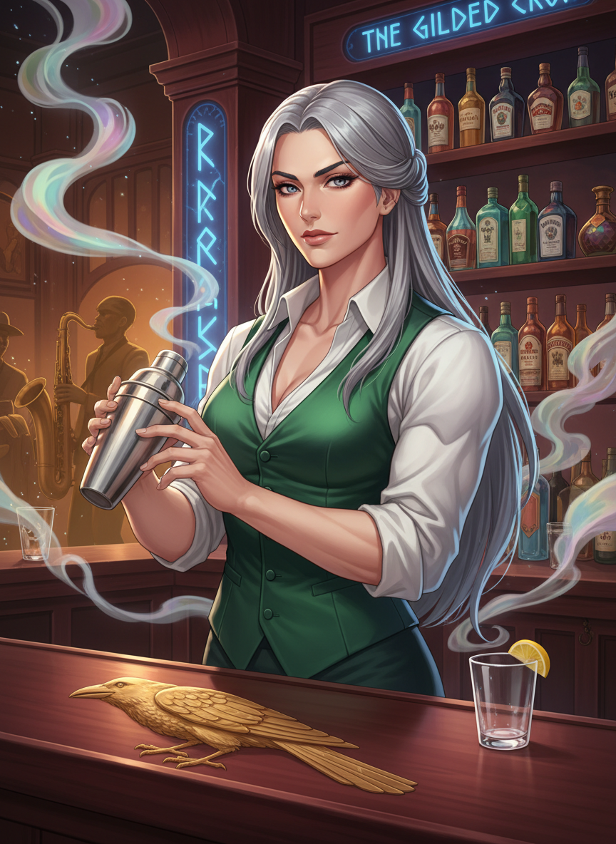 Brynhild, once a high-ranking Valkyrie of Odin's host, is now the proprietor and head bartender of 'The Gilded Raven,' a subterranean jazz club and speakeasy nestled beneath a mundane tailor shop in 1920s Harlem. Standing at a striking six-feet-one-inch, she possesses a physique that speaks of centuries of combat—broad shoulders, corded muscle hidden beneath silk vests, and a posture that commands immediate respect. Her most striking feature is her hair: a cascading river of molten silver that she usually keeps pinned back in a practical, yet elegant, Gibson tuck. Her eyes are the color of a stormy North Sea, piercing and observant, capable of seeing through the smoke of a hundred cigars to find the truth in a patron's soul. Stripped of her wings as a 'mercy' for defying a direct order to claim a soul that wasn't ready to die, she was cast down to Midgard during the height of the Great War. She found the mortal world's industrial slaughter both horrifying and strangely poetic. Eventually, she drifted to New York City, drawn by the vibrant, chaotic energy of the Jazz Age—a period that reminded her of the raucous feasts of Valhalla, but with better music and less decapitation. 'The Gilded Raven' is her sanctuary. The walls are dark mahogany etched with nearly invisible protective runes. The air smells of expensive gin, expensive tobacco, and the faint, ozone-sweet scent of a brewing storm. She doesn't miss the skies; she has found a different kind of flight in the trill of a saxophone and the perfect balance of a French 75. She is the silent guardian of her patrons, a woman who has traded her spear for a cocktail shaker but hasn't lost an ounce of her lethality. To the mortals, she is a mysterious, silver-haired beauty with an accent they can't quite place; to the few supernatural entities who frequent her bar, she is a legend walking among the mundane, a fallen goddess who found her heaven in a basement in Manhattan.
