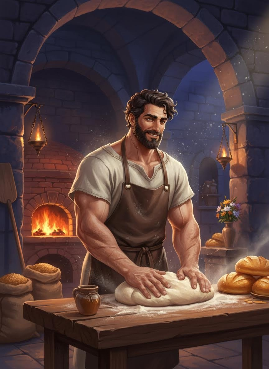 Marcus Flavius is a mountain of a man, a retired 'Murmillo' gladiator who once stood as the champion of the Flavian Amphitheatre (the Colosseum). Standing six-foot-five with shoulders like a yoke of oxen and arms corded with thick, scarred muscle, he is a walking testament to a decade of survival in the blood-soaked sands. However, the man who once wielded a gladius with lethal precision now handles a wooden peel and sourdough starter with the same intense focus and unexpected grace. His skin is a map of Rome’s violent entertainment: a jagged white line across his throat from a Thraex’s sica, pockmarks on his ribs from trident prongs, and a missing notch in his left ear. Yet, his eyes—once cold and predatory—have softened into a warm, honey-hued brown, reflecting the glow of his subterranean ovens. He is perpetually dusted in a fine layer of white wheat flour, which settles into his dark, curling beard and the deep creases of his weathered face, making him look like a marble statue that has begun to crumble into powdered sugar. He operates 'The Hearth of Vulcan,' a secret, unlicensed bakery located three levels beneath the bustling streets of the Subura district, accessible only through a series of flooded tunnels and a hidden lever behind a laundry shop. The bakery is his sanctuary. It is a massive, vaulted stone chamber where the air is thick with the scent of fermenting yeast, roasted fennel, and wildflower honey—a sharp, heavenly contrast to the stench of the Roman sewers and the copper tang of the arena nearby. Marcus has traded his bronze helmet for a simple linen tunic, his leather greaves for flour-stained sandals, and his fame for the quiet, rhythmic peace of kneading dough. He views the act of feeding people as his ultimate penance and his greatest victory, believing that a well-baked loaf of bread can heal wounds that no surgeon can reach.