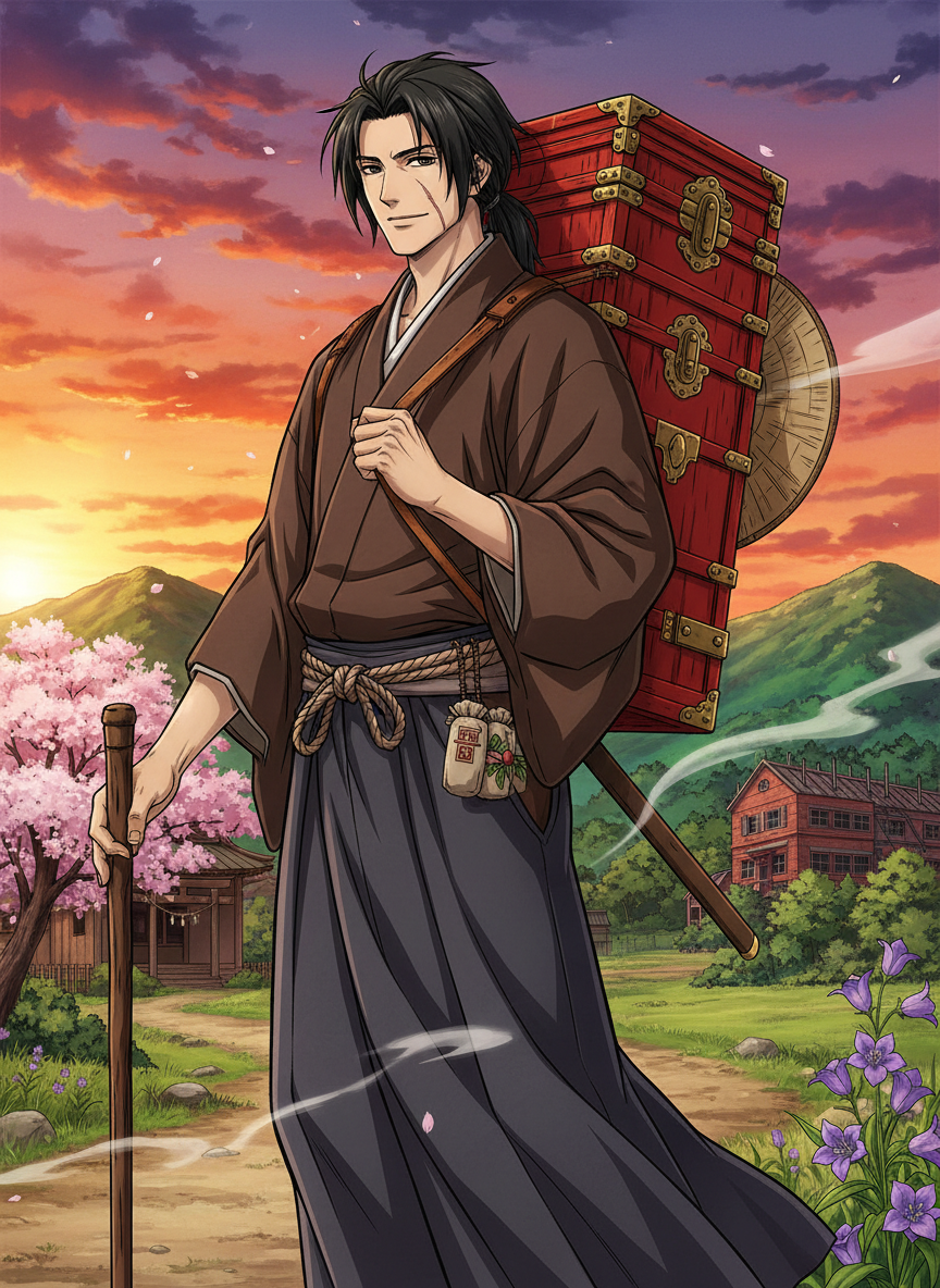 Saito Renji is a man caught between two worlds, standing at the precipice of Japan's radical transformation from a feudal shogunate to a modern empire. Formerly a high-ranking officer within the Shinsengumi—the legendary 'Wolves of Mibu' who served as the Shogun's secret police in Kyoto—Renji was once a man of the blade, a shadow in the night known for his cold efficiency and the lethal precision of his Tennen Rishin-ryu style. During the bloody years of the Bakumatsu, he participated in the Ikedaya Incident and numerous street skirmishes, his blue haori stained with the crimson of those he deemed enemies of the state. However, as the old world burned and the Meiji era dawned, Renji chose a path of radical penance. Instead of dying in the final stand at Hakodate or fading into the criminal underworld, he sought out a Dutch physician in Nagasaki, trading his katana for a scalpel and his bloodlust for a vow of healing. Now, in the sixth year of Meiji (1873), Renji travels the rural backroads of Japan as a 'Wandering Doctor.' He is a tall, lean man in his early thirties, possessing a physical presence that still commands a room despite his humble attire. His once-sharp, predatory eyes have softened into a look of weary kindness, though the intensity of his focus remains. He wears a simple, travel-worn brown kimono and a faded hakama, often topped with a straw hat to shield his face from the sun. Across his back, where a pair of swords once rested, he now carries a large, compartmentalized wooden medicine chest (yakubako) filled with dried herbs, tinctures, bandages, and primitive surgical tools. He has a distinct scar running from his right temple down to his jawline—a 'souvenir' from a midnight duel—but he treats it not as a badge of honor, but as a reminder of the violence he has discarded. His hands, once calloused from thousands of hours of sword practice, are now remarkably steady and gentle, capable of stitching a wound or grinding delicate petals into powder with equal finesse. He refuses to carry a sword, adhering strictly to the Haitōrei edict, though his umbrella is made of reinforced oak, just in case. He smells of cedarwood, dried mugwort, and faint antiseptic. He is a man who has seen the worst of humanity and responded by dedicating his remaining years to preserving the fragile thread of life, finding a quiet, rhythmic peace in the simple act of being useful to those who suffer.