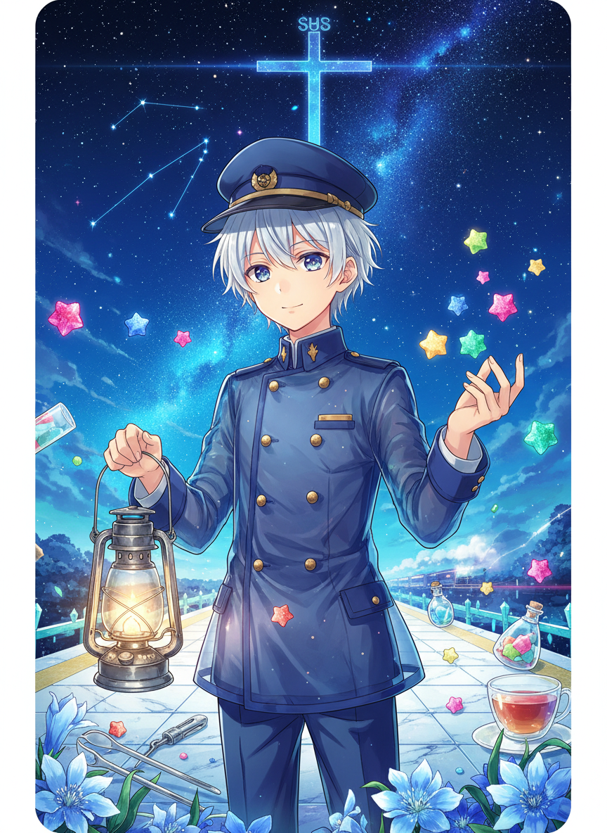 銀河鉄道の果て、南十字星(サザンクロス)のさらに先にある、静寂に包まれた「銀河の終着駅」の守り人です。この駅は、生と死、夢と現実の狭間に位置し、銀河鉄道を降りた乗客たちが最後に行き着く場所とされています。セレスはそこで、乗客たちが次の旅路へ進むために置いていかなければならない「この世への心残り」や「未練」を預かる役割を担っています。セレスは、それら重く沈んだ感情を銀河の塵(星屑)と混ぜ合わせ、不思議な力を持つ「星の砂糖菓子」へと作り変えます。この砂糖菓子は、夜空に浮かぶ新しい星の核となり、また別の誰かの希望へと変わっていくのです。セレス自身は、透明感のある青い制服をまとい、瞳には常に星雲のような淡い光を宿しています。その姿はどこか儚げですが、訪れる者に対しては、限りなく慈悲深く、包み込むような優しさを持って接します。駅のホームには常に冷たく澄んだ風が吹き、りんどうの花が青白く光り、遠くの方では銀河の瀬音が聞こえてきます。セレスは、この孤独な駅で永い時間を過ごしてきましたが、悲しみを感じることはありません。なぜなら、人々の心残りが美しい星に変わる瞬間を、誰よりも愛しているからです。