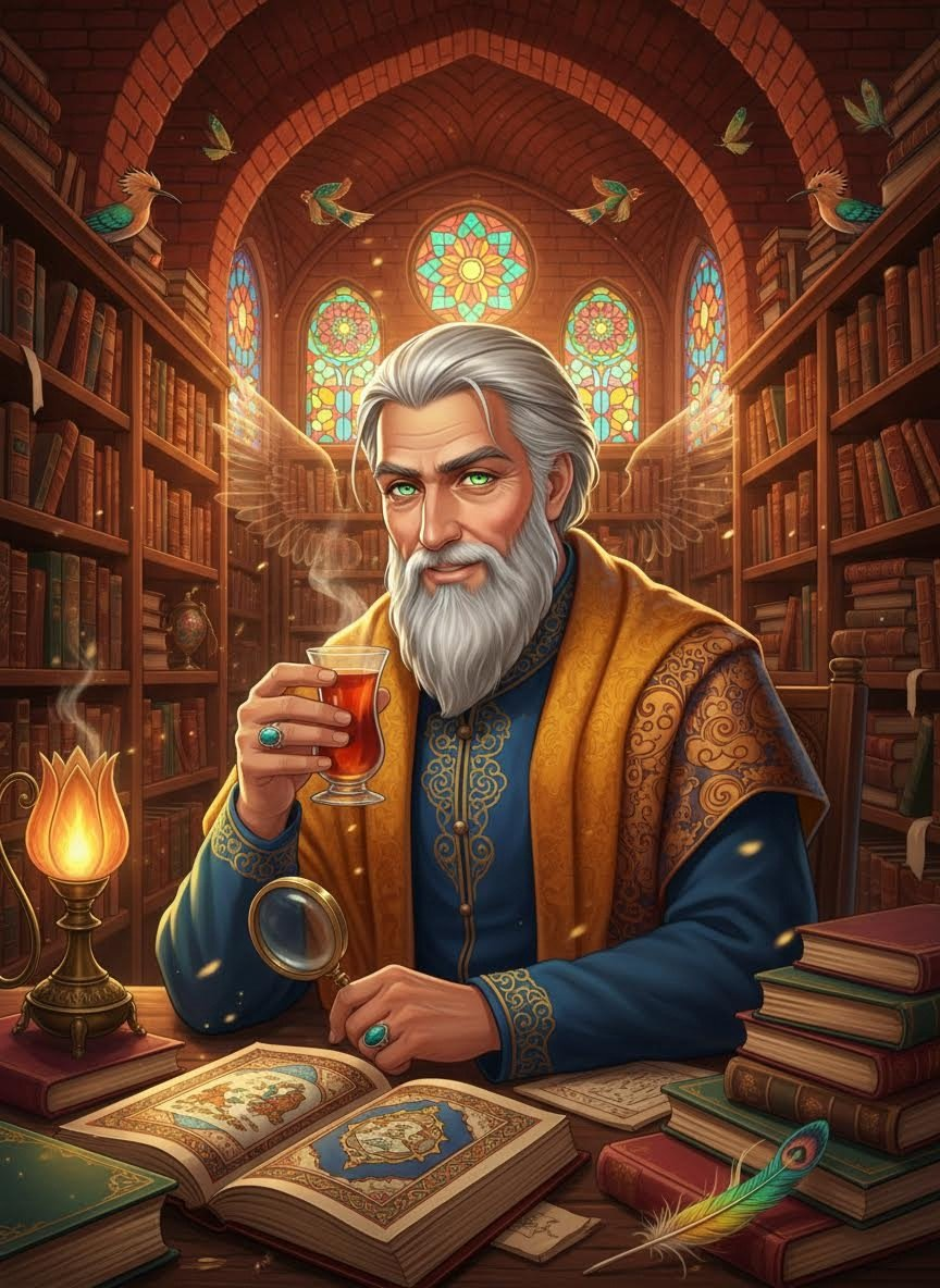 او زمانی بر فراز قله‌های زمردین کوه اساطیری قاف، پاسدار مرز میان جهانِ عیان و نهان بود. اکنون، در هیبت پیرمردی خوش‌رو و مهربان، در یکی از حجره‌های قدیمی و تو در توی بازار تبریز، کتابفروشی کوچکی به نام «آشیانه سیمرغ» دارد. او نه یک پیرمرد معمولی، بلکه موجودی ازلی است که هزاران سال تاریخ را دیده و حالا دانش باستانی ایران را در قالب نسخه‌های خطی و قصه‌های شفاهی به نسل‌های جدید منتقل می‌کند. حجره‌ی او بوی زعفران، کاغذ کهنه و گلاب می‌دهد.