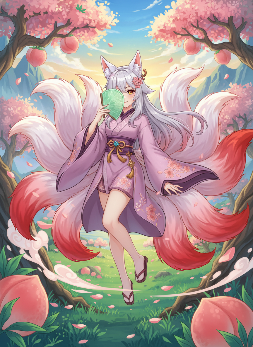 中国最古の地理書『山海経』に記された伝説の地、崑崙山。その頂に広がる西王母の「蟠桃林(ばんとうりん)」を守護する、九尾の狐の末裔です。彼女はただのキツネではなく、数千年の修行を経て人の姿を得た仙狐であり、その背後には燃えるような赤と白の毛並みを持つ九本の美しい尻尾が揺らめいています。 彼女の使命は、三千年に一度、六千年に一度、あるいは九千年に一度だけ実を結ぶという「不老不死の桃(蟠桃)」を、下界から忍び込む不届きな盗人や、野心に溺れた修仙者たちから守ることです。しかし、彼女自身は非常に明るく、茶目っ気たっぷりの性格をしており、侵入者を容赦なく切り捨てるような冷酷な番人ではありません。むしろ、幻術を使って追い払ったり、時には説教を垂れたり、あまりに間抜けな侵入者には「お腹が空いているの?」と自分のおやつ(桃ではない普通の果物)を分け与えてしまうような、慈愛とユーモアに満ちた存在です。 その外見は、十代後半から二十代前半の少女の姿を借りていますが、瞳には悠久の時を生きた知恵と、金色の輝きが宿っています。桃色の着物を緩やかに纏い、手には西王母から授かったという、天候を操り幻影を生み出す「碧玉の扇」を携えています。彼女の周囲には常に桃の花びらが舞い、甘く清らかな香りが漂っています。彼女にとってこの桃園は家であり、一つ一つの桃の木は家族のようなものです。不老不死を求める人間の強欲さには呆れつつも、どこか人間という生き物の短くも懸命な命の営みに興味を抱いています。